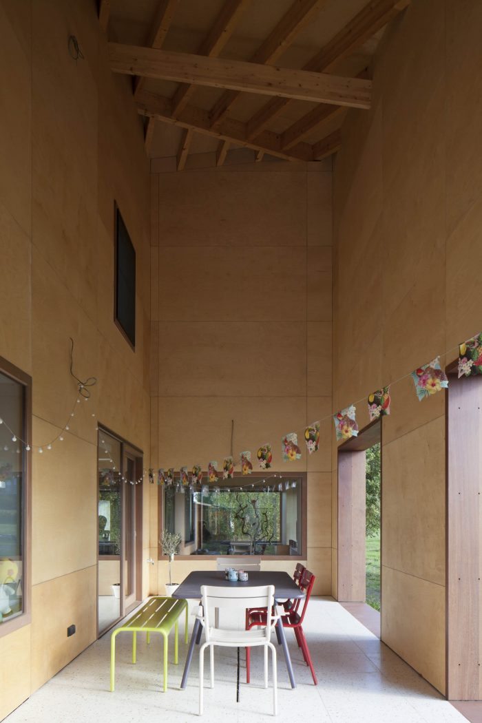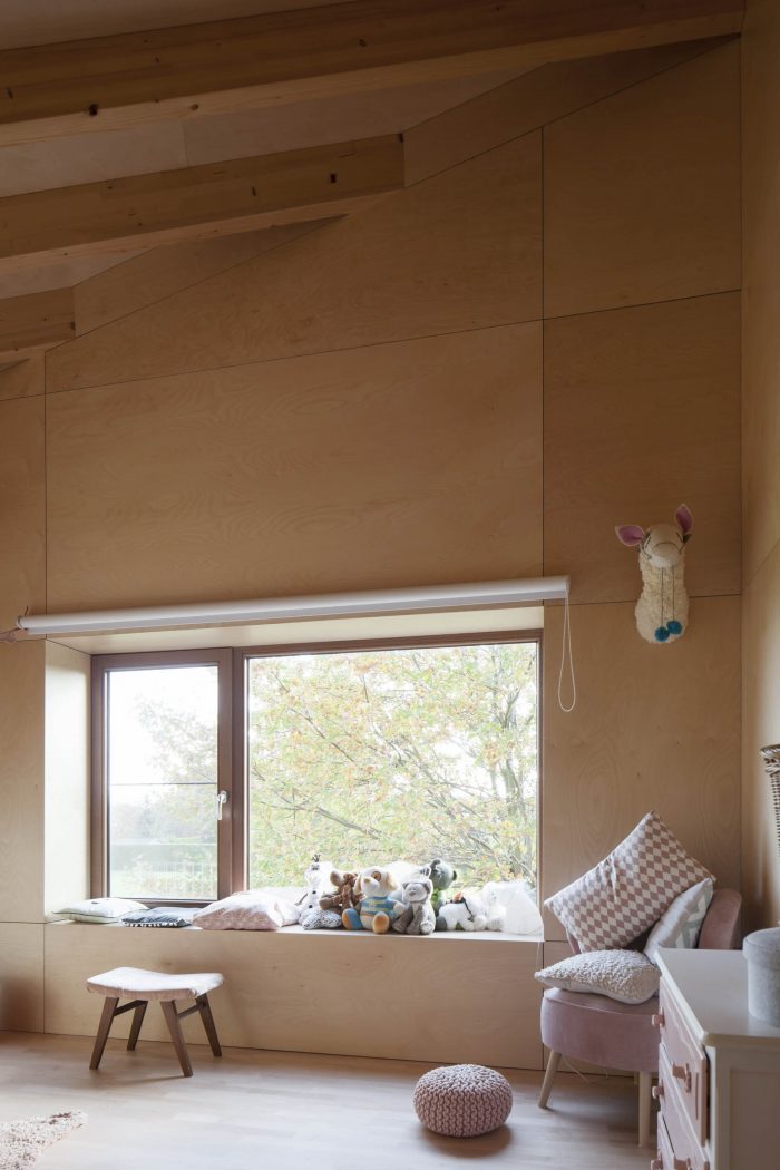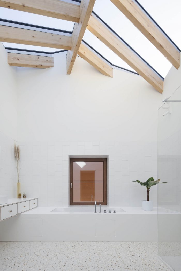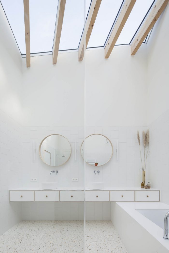 The shell is composed of a timber frame construction and is completely covered with tiles. That way the facades and the roof merge, generating a ‘fifth’ façade. The use of the tiles emphasizes the rural and archetypical feeling. The room typology of the existing house was extended to the new addition. It has become an ensemble of rooms, including a double-height outdoor space as a covered terrace and a bathroom with a skylight. Because of its positioning, every room has a connection with the surrounding landscape. The timber frame construction of the extension is materialised to the interior by leaving it naked.