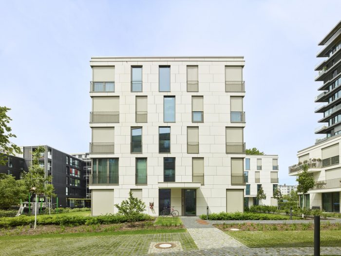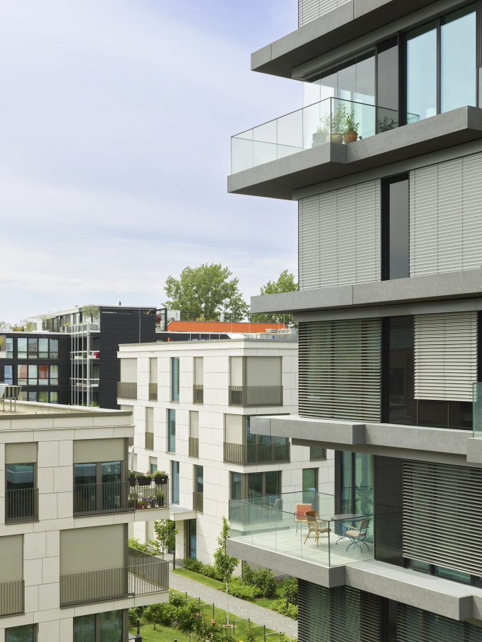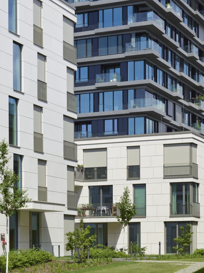由TCHOBAN VOSS Architekten设计的三层、四层和五层的 "花园洋房 "被安排在安静的内部区域相互抵消,共配备了24个中型到大型单位的高档标准。浅色的外墙,由天然石材的檐带分割,三个体量都有宽大的阳台和落地的全景窗,或交替的金属框架的法式窗。由于采用了钢筋混凝土骨架结构和预定的轴线安排,楼层计划是可变的,并允许生活空间的个性化调整。天花板和电梯井是用整体混凝土浇筑的,而内墙则是用干墙建造的,以提高灵活性。