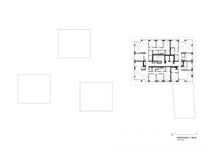 在公寓楼的屋顶上,有9个最大面积为60平方米的商务住宅单元,分布在三个楼层,有一个公共的屋顶露台,有城市园艺区,可以看到该区的公园。一条河边长廊将绿洲区与施普雷河连接起来。通过景观阳光甲板可以进入,上面有各种座位和休息的选择。一个共享的两层地下停车场,只对住户开放,共可容纳104辆车,还为电动车和自行车提供充电站。