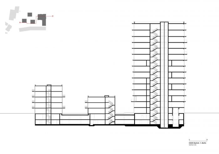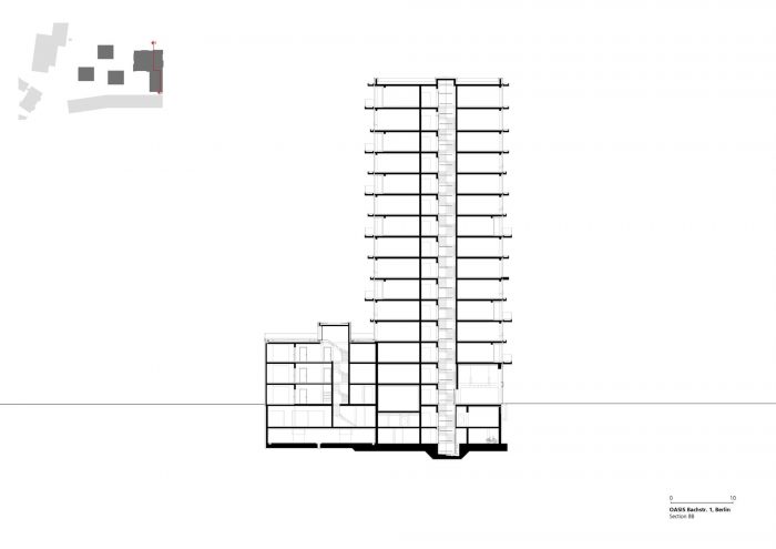 The fifteen-story solitaire "Oasis Tower" with a panoramic view of Berlin's Tiergarten and Zoological Garden is positioned towards Altonaer Strasse and unfolds its largely visible urban effect with its differentiated façade The position of the building, which is monolithically constructed in the reinforced concrete skeleton, mitigates the street noise inside the property. The façade is articulated by horizontal dark grey concrete bands and features opaque and translucent glass panels and glazed corner loggias. The tower offers space for 68 residential units. The building is entered through a spacious two-story lobby.