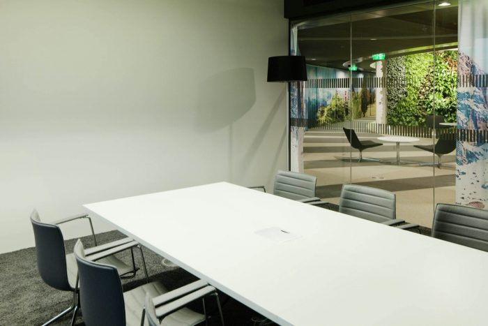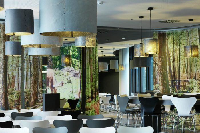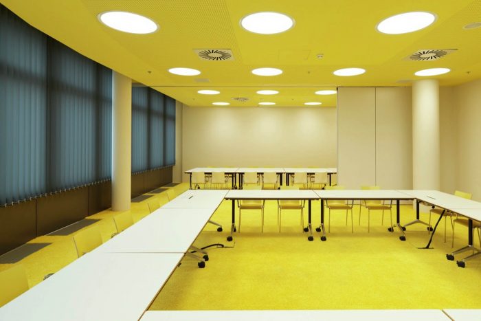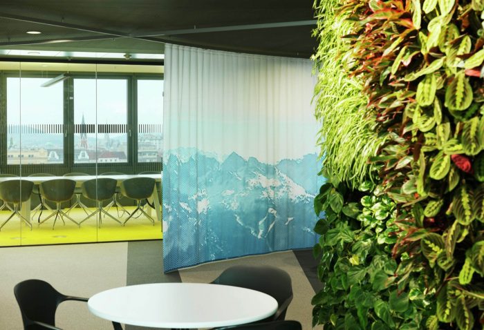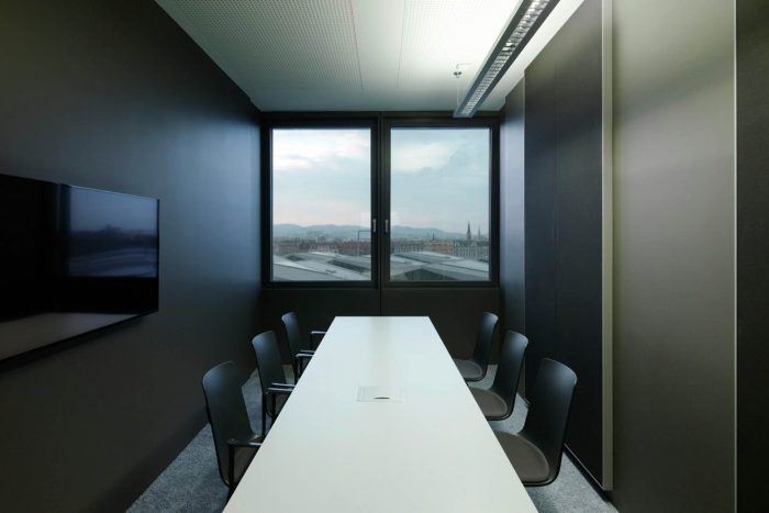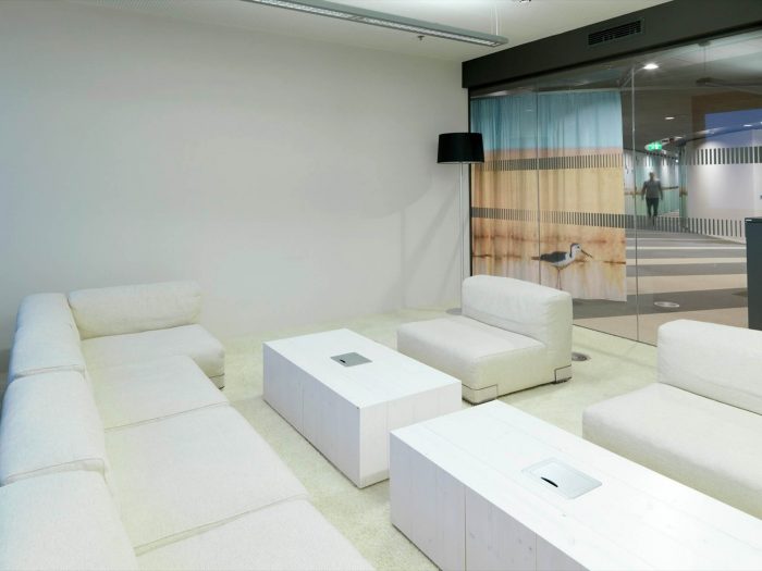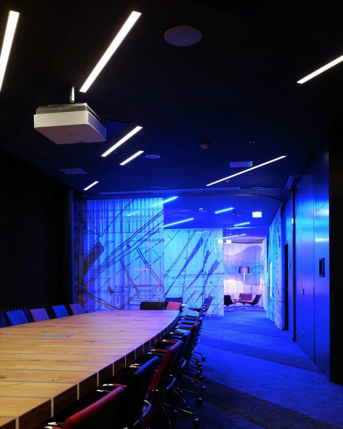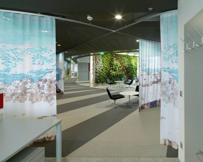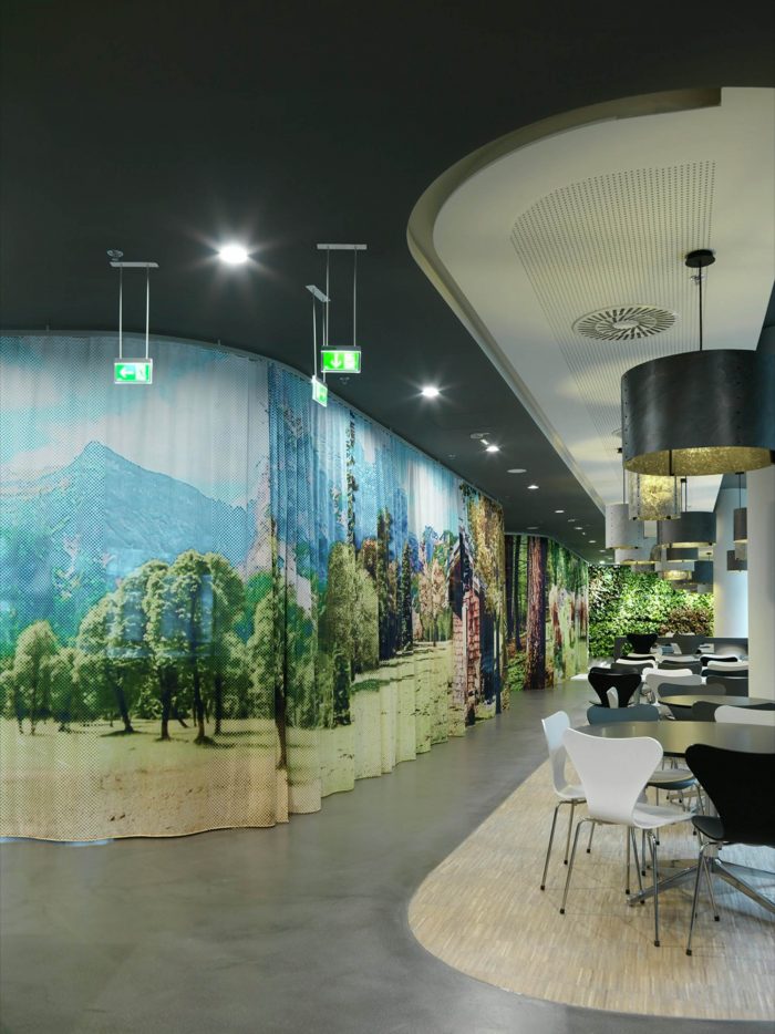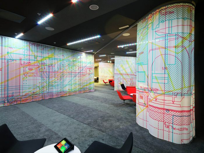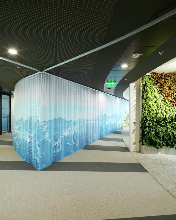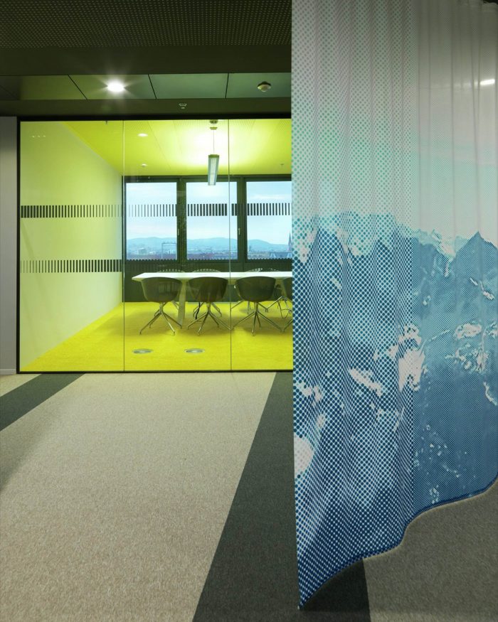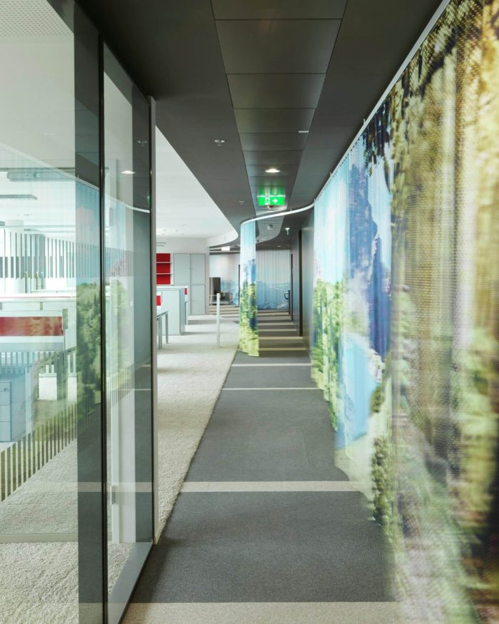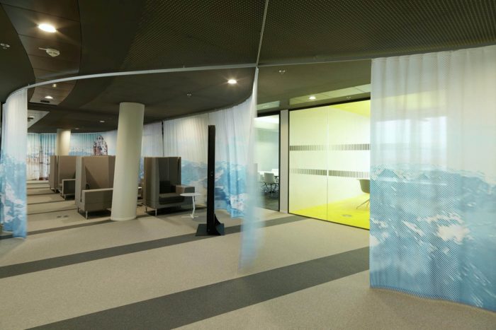 Open and closed communication areas, as well as retreat areas are positioned along the middle zone, to create a communicative center and to avoid an overlapping with focused working. Even in the multi-functional Sky Lobby this design concept continues. The textile room divider enables variable zoning and interaction with lighting and graphics generating diverse atmospheres.