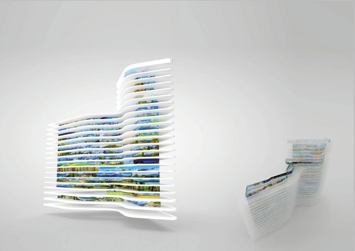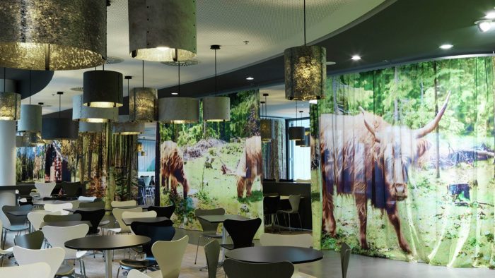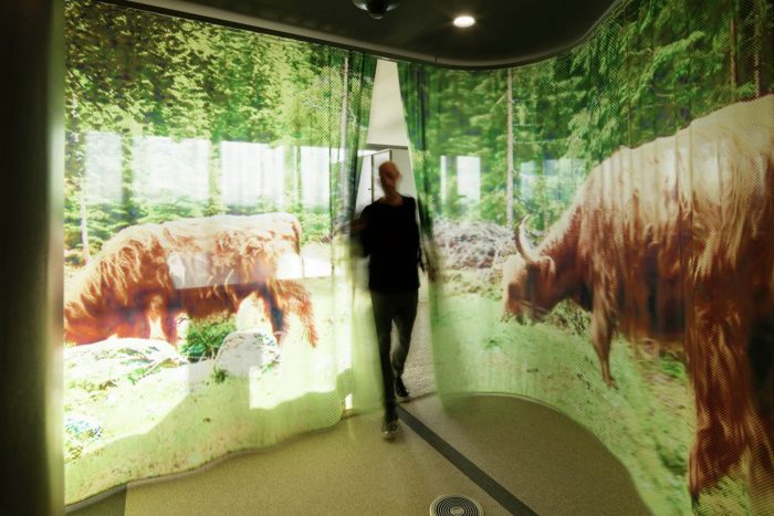 As a result, the line element of the ÖBB’s CI was newly interpreted and this fresh algorithm was used as a key design tool. Working with United Everything, INNOCAD designed the heart of the project; A 3.6 km long, movable screen spanning all 23 floors, showing an exquisite voyage through Austria and featuring zoning, atmospheric and acoustic qualities. This unique design depicts the rythmization and mobility of passing landscapes as a sequence of visual sensations both accelerating and decelerating across the screens.