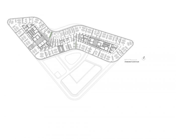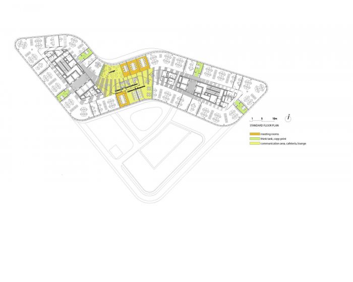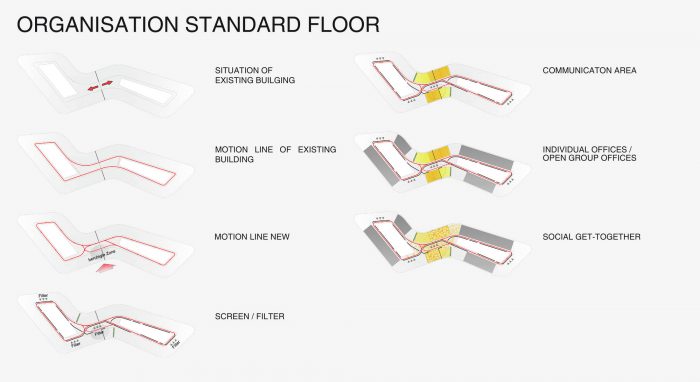 该概念的功能策略旨在反映对沟通的需求大大增加,特别是自发的沟通,目的是创造一个现代工作环境。 同时,该空间通过一个明显界定的结果空间,以及针对不同需求的明确的功能区划分,承认了对隐私和集中的需求。
