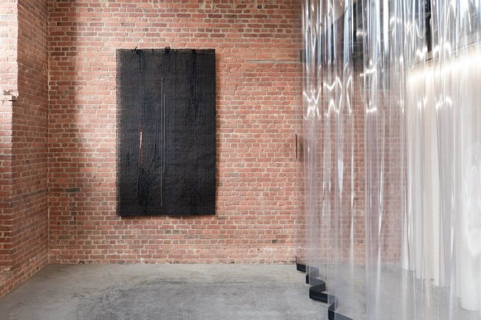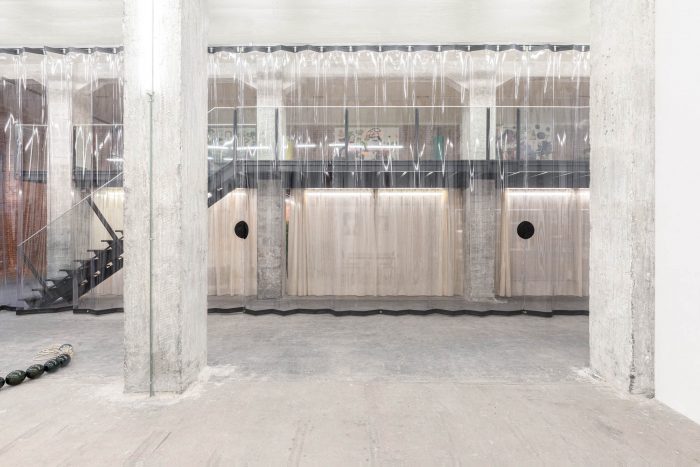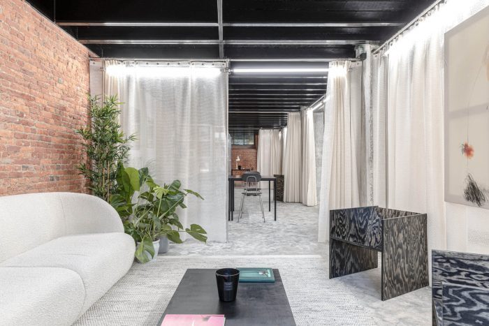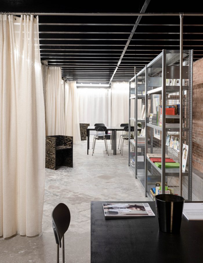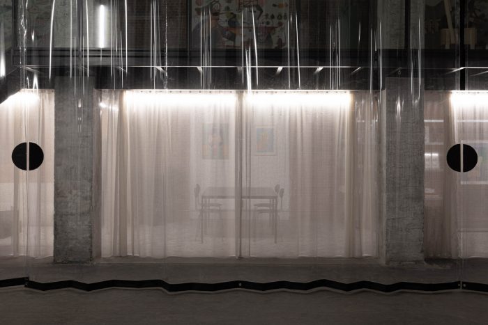 To address the industrial scale of the space, we introduced the use of a double-height transparent heavy curtain, that would commonly be found in a factory to separate different activities, in this case, it is not only a separator but also an integrator between the spaces. The transparent curtain acts as a glass facade to the mezzanine, keeping the two climates separate while maintaining a dialogue between them. It is important for us to understand the range of possibilities that textile could introduce as a spacemaker.