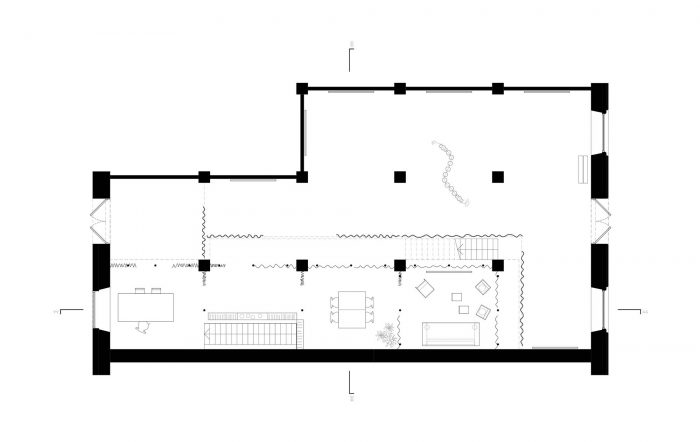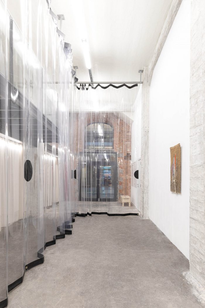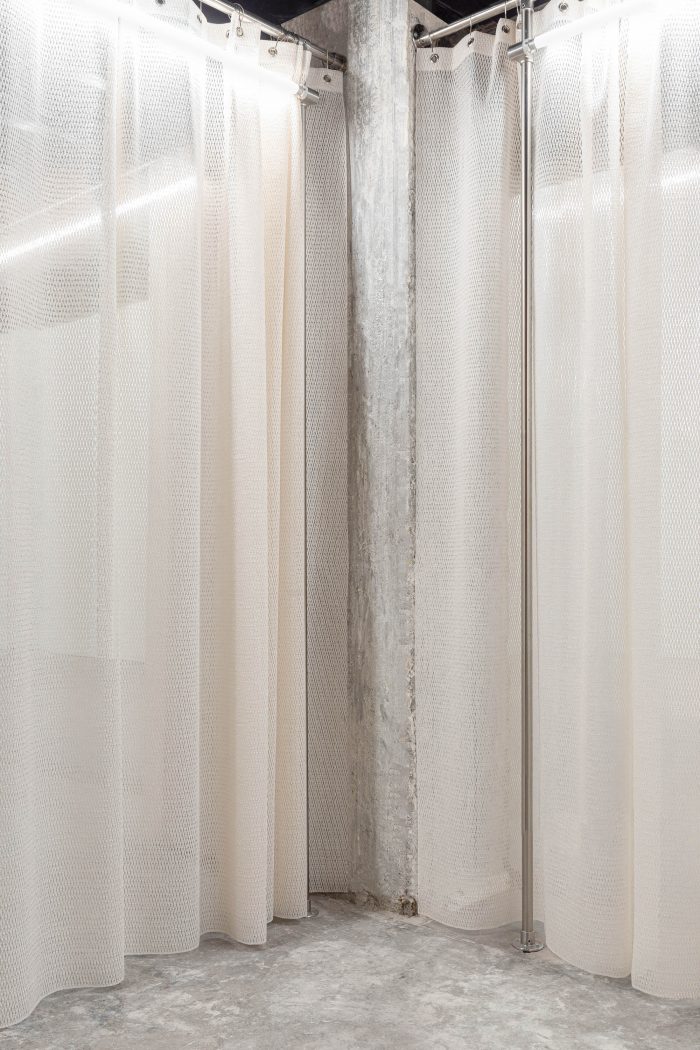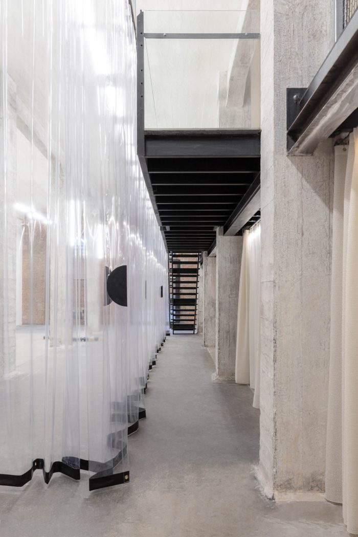 为了解决空间的工业规模问题,我们引入了一个双高的透明厚重的幕布的使用,这种幕布通常在工厂里会被发现,用来分隔不同的活动,在这种情况下,它不仅是一个分隔器,也是空间之间的整合器。透明的幕布作为夹层的玻璃幕墙,使两种气候保持分离,同时保持它们之间的对话。对我们来说,重要的是了解纺织品作为空间制造者可以引入的一系列可能性。