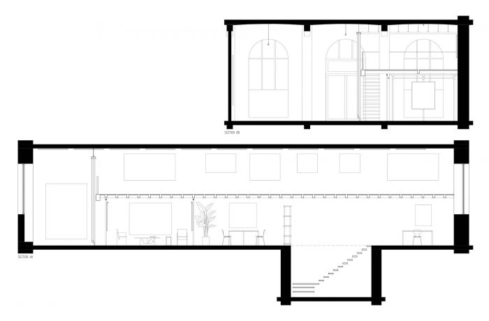 The gallery has a very straightforward program: Two exhibition spaces, and "office" spaces. In a way, it was easy to define it into two categories: exhibition space vs office space. Yet we believe that every exhibition has to show its own identity through its own scenographic complexity. Since the space was large and open, this created a challenge, to give both exhibition spaces enough appropriation, without ignoring the unity of the space as a whole. The office spaces, located under the mezzanine, were created through a set of stainless steel scaffolding structures.