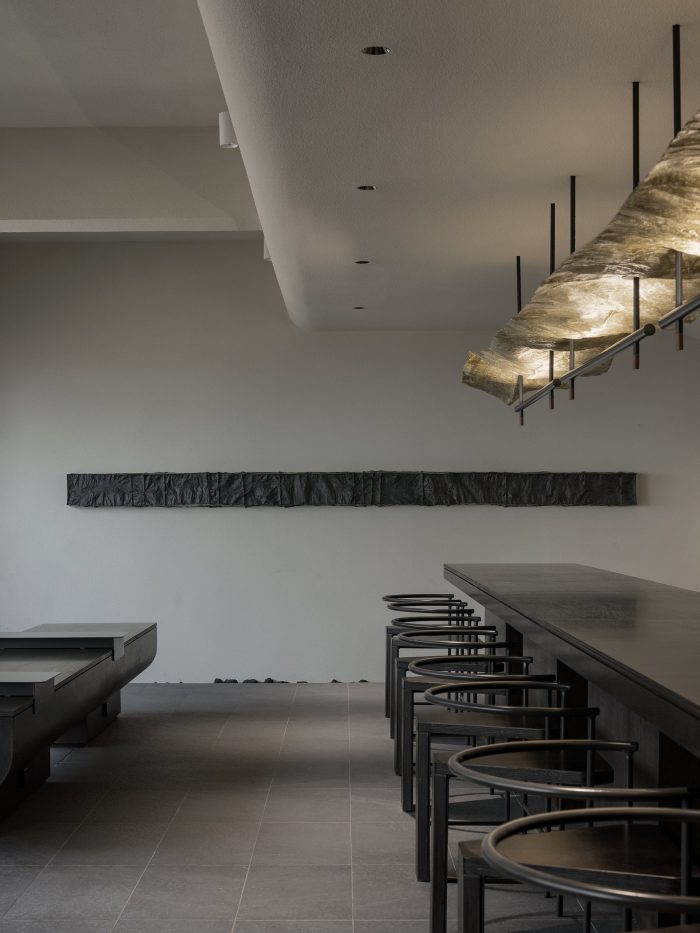 对现有空间的简单和线性形式,设计团队在天花板设计中加入了曲线元素,以激起舒适的气氛。与其说是复杂和动态的,不如说是对几何元素的重新诠释,如点、线、面,激发了空间设计的灵感,创造了一个轻松和简约的氛围。
