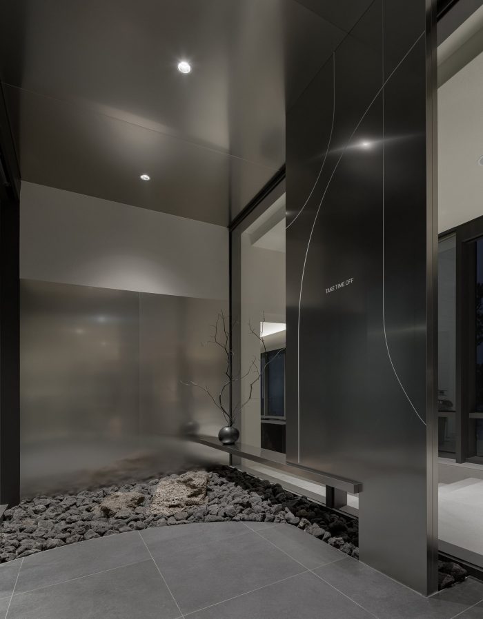 To the simple and linear forms of the existing space, the design team incorporates curved elements in the ceiling design to provoke a comfortable atmosphere. Rather than being complex and dynamic, the reinterpretation of geometric elements, such as point, line, and plane, inspired the spatial design, creating a relaxing and minimal ambiance.