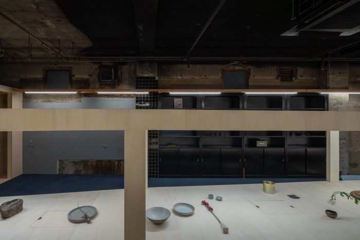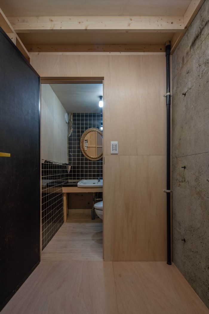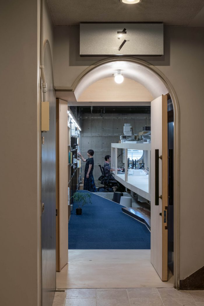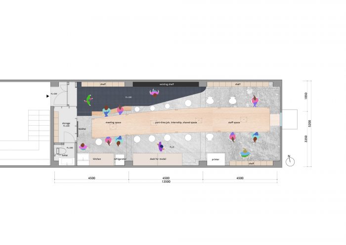 When the existing ceiling and floor were dismantled, an inverted beam appeared from the floor. h=280 high, the beam was used as a foundation for the desk, and the top was enclosed to create a small room floating in the room. The area of the room was too small to be divided by walls into an office and a restroom. In this room, people work by leaning forward into the desk, and leaning back when taking a break. The aim was to encourage people to change their minds by going in and out of the desks in a small room floating in the air.