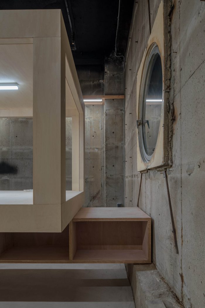 当现有的天花板和地板被拆除后,一根倒置的横梁从地板上出现。h=280高,横梁被用作办公桌的基础,顶部被封闭起来,形成一个漂浮在房间里的小房间。这个房间的面积太小,无法用墙将其分成办公室和洗手间。在这个房间里,人们的工作方式是向前靠在桌子上,休息时向后靠。其目的是鼓励人们在漂浮在空中的小房间里通过进出办公桌来改变他们的想法。