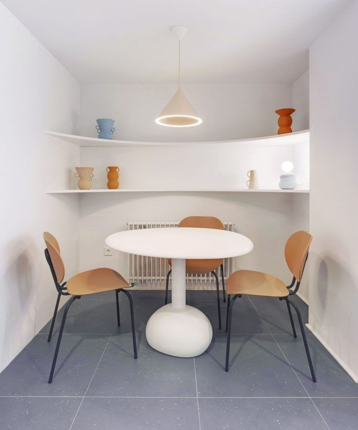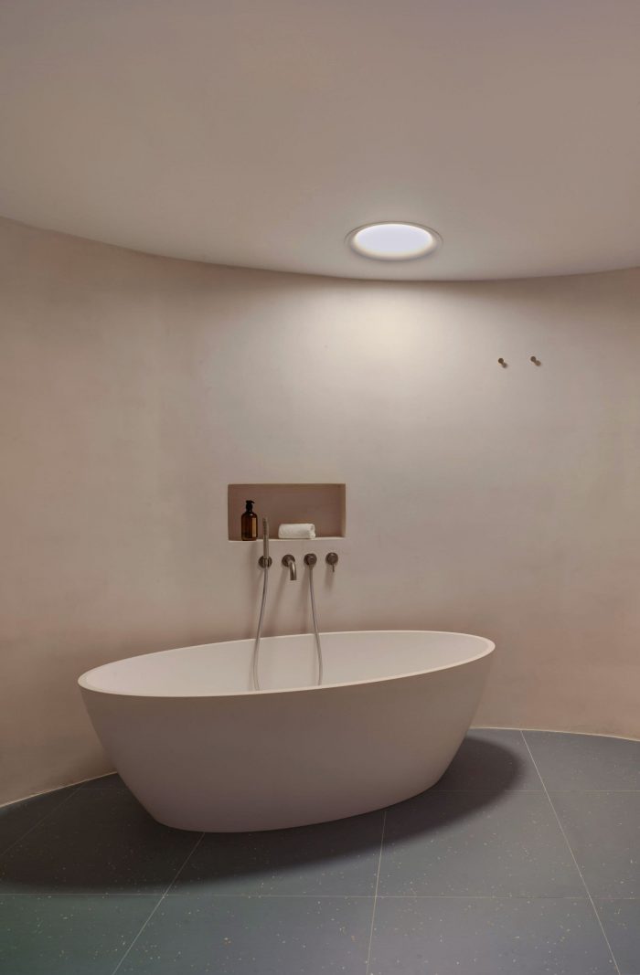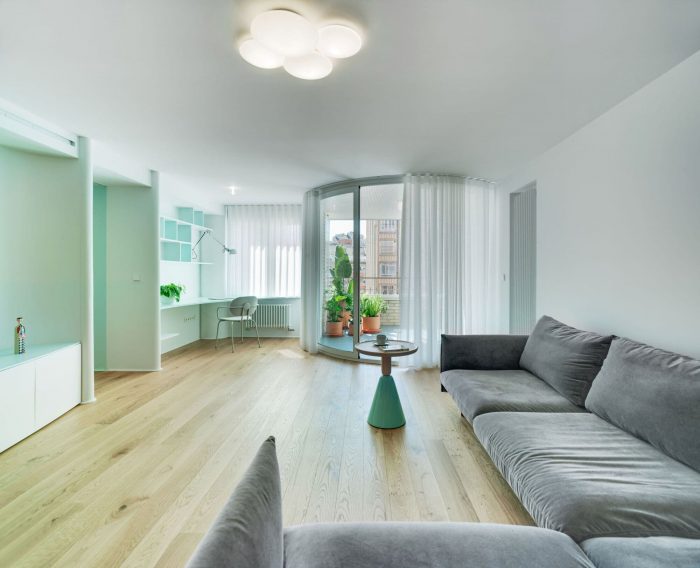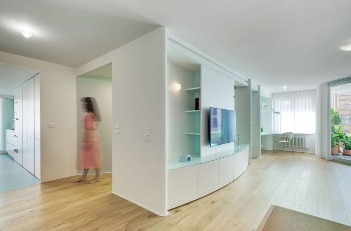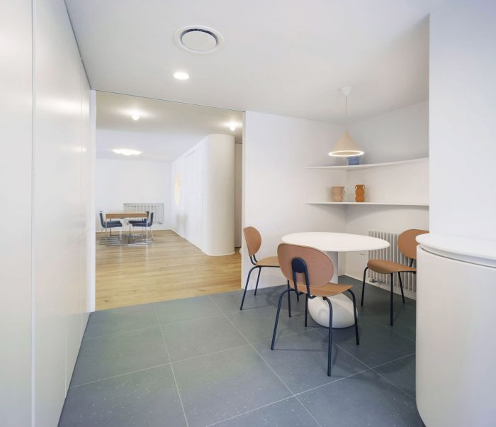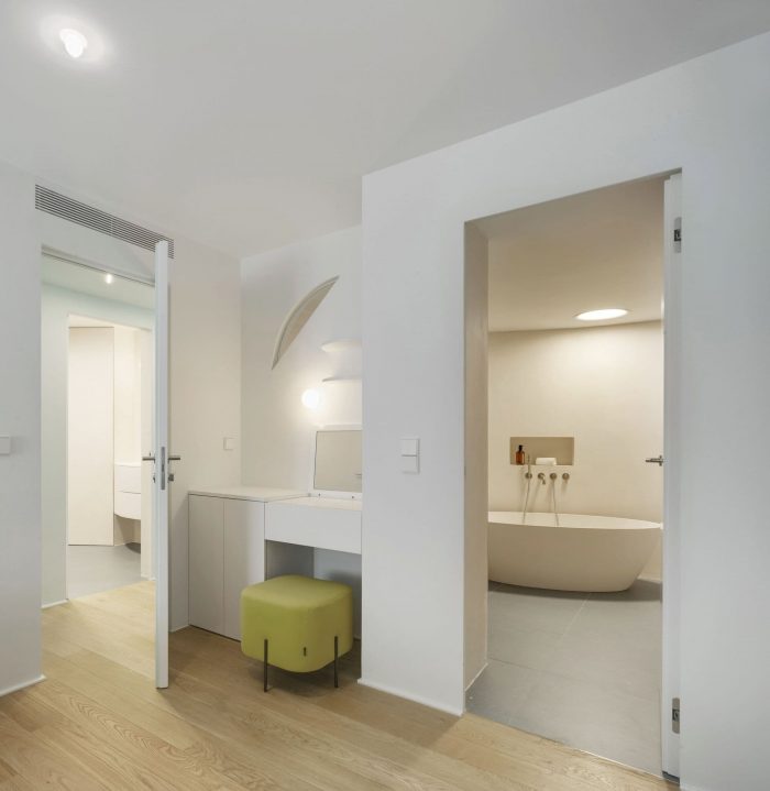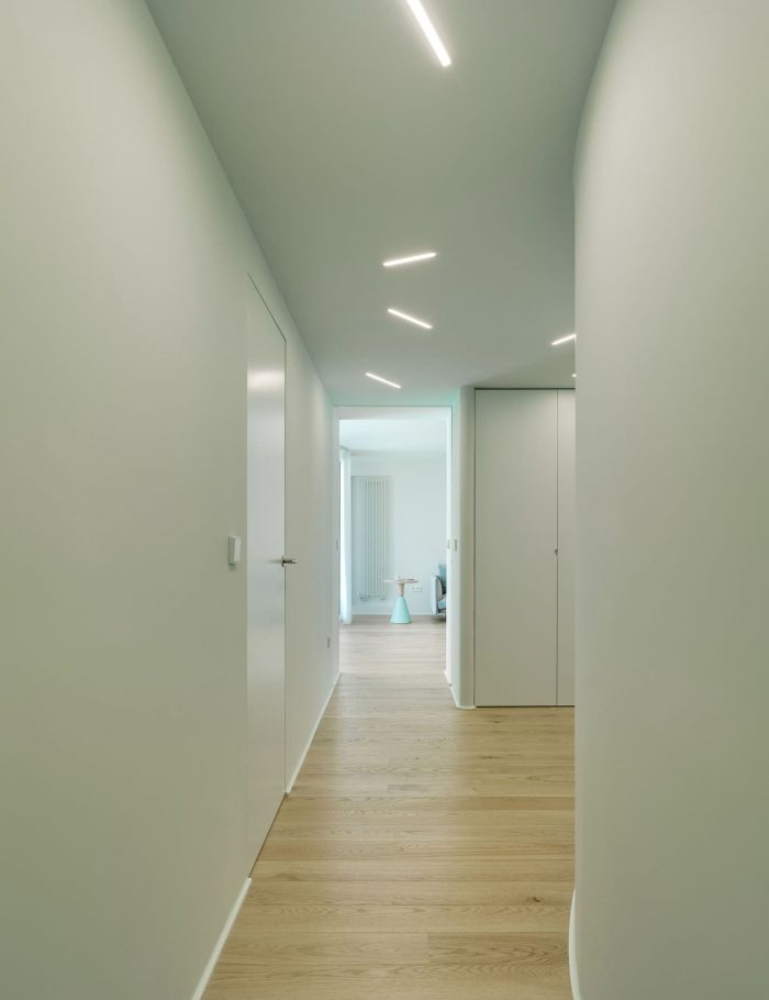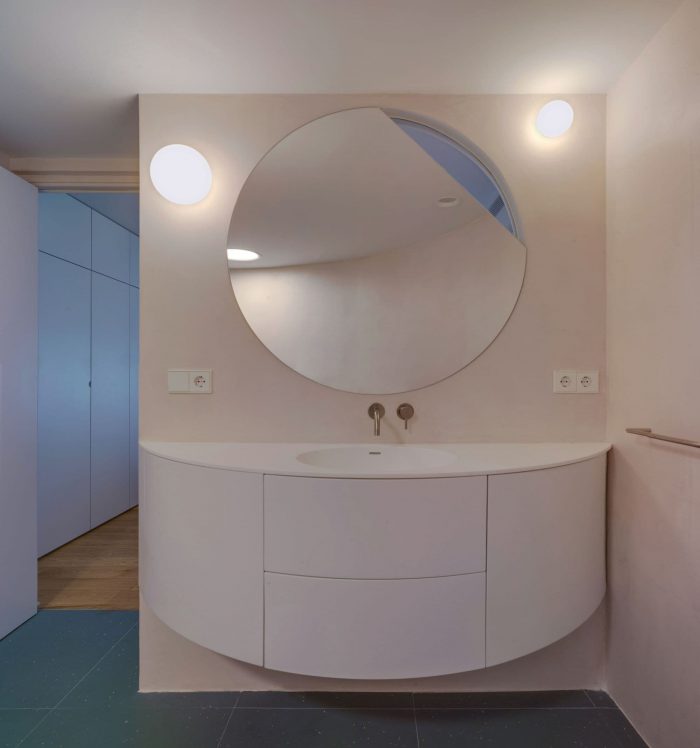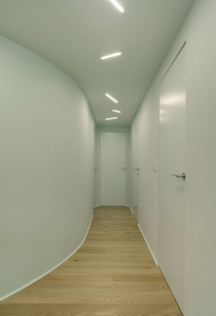 There were two entrances but we decided to cancel one of them, so the access now is in the middle of the house. Like a kind of spiral (or seashell), the house is organized around a curved center that slides you into the rooms. This route is carried out through a compressed space in an aquamarine green tone that causes an expanding effect when you “go out” to the adjoining rooms.
