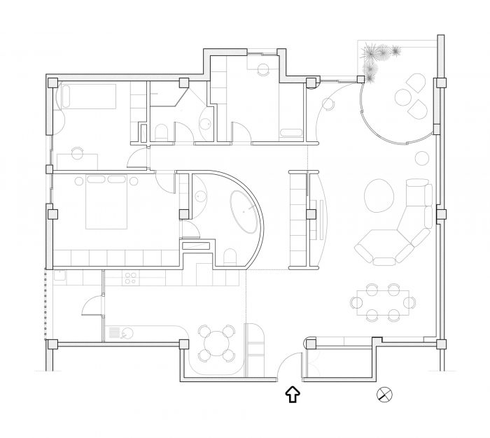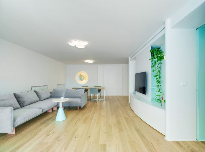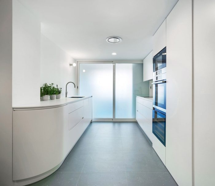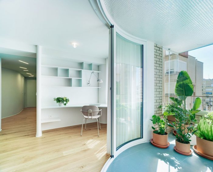 Another key piece was to extend the terrace with a curved sliding balcony, something very special that creates an outdoor corner where you really want to be. The selected plants have a tropical look and the iridescent tile ceiling brings to mind the reflections of the sea.