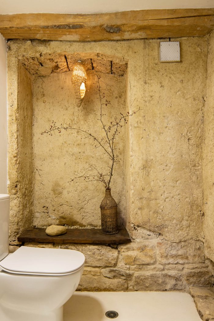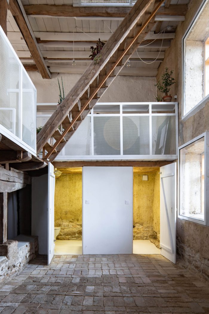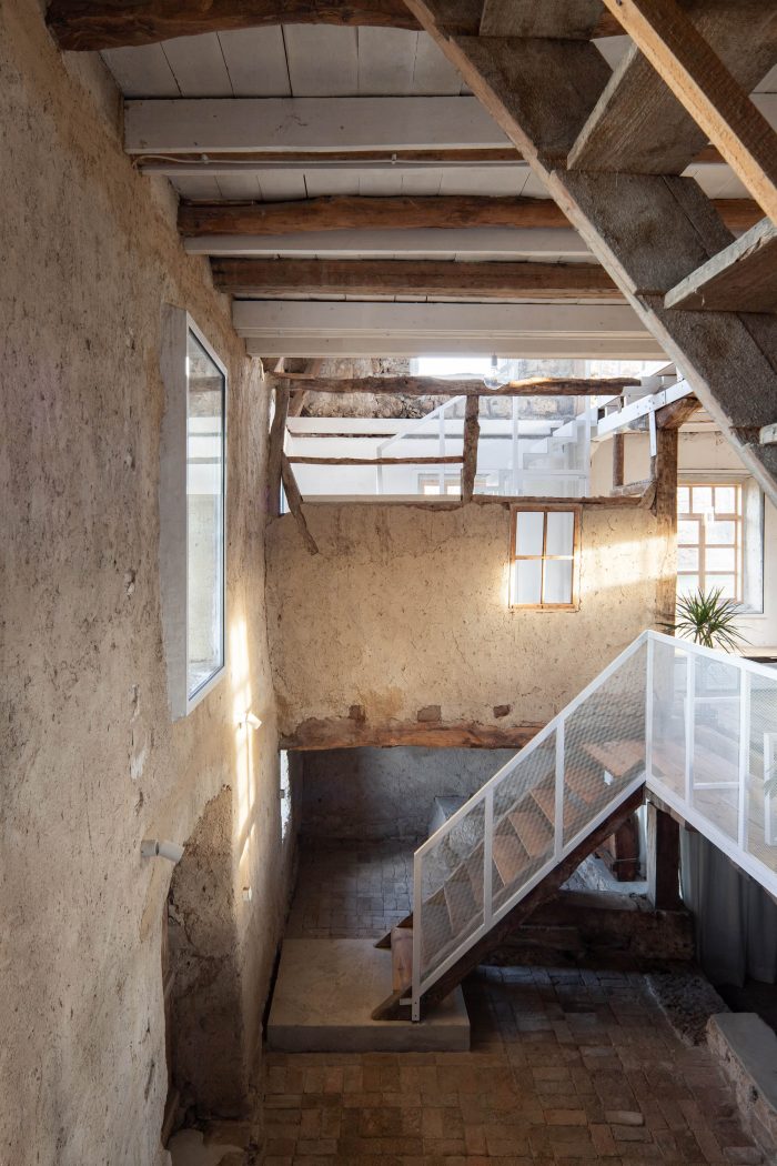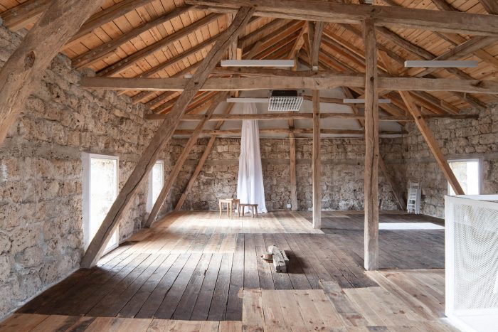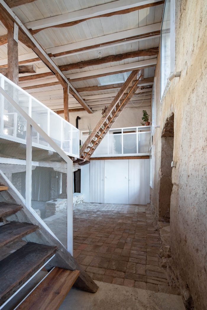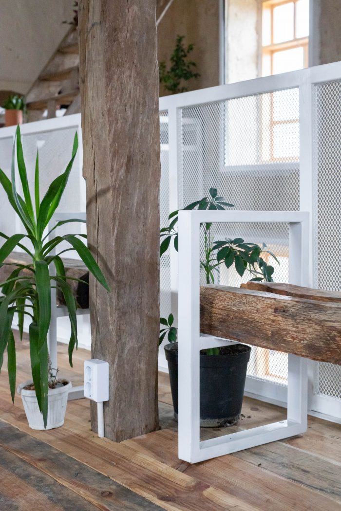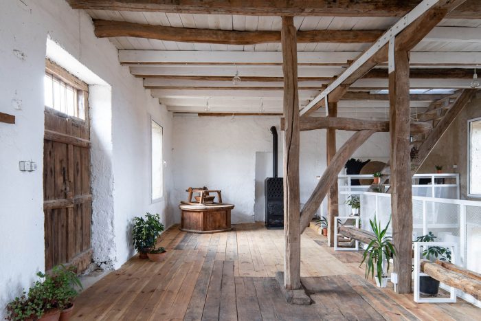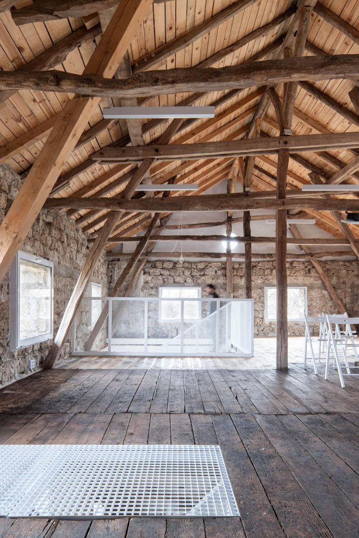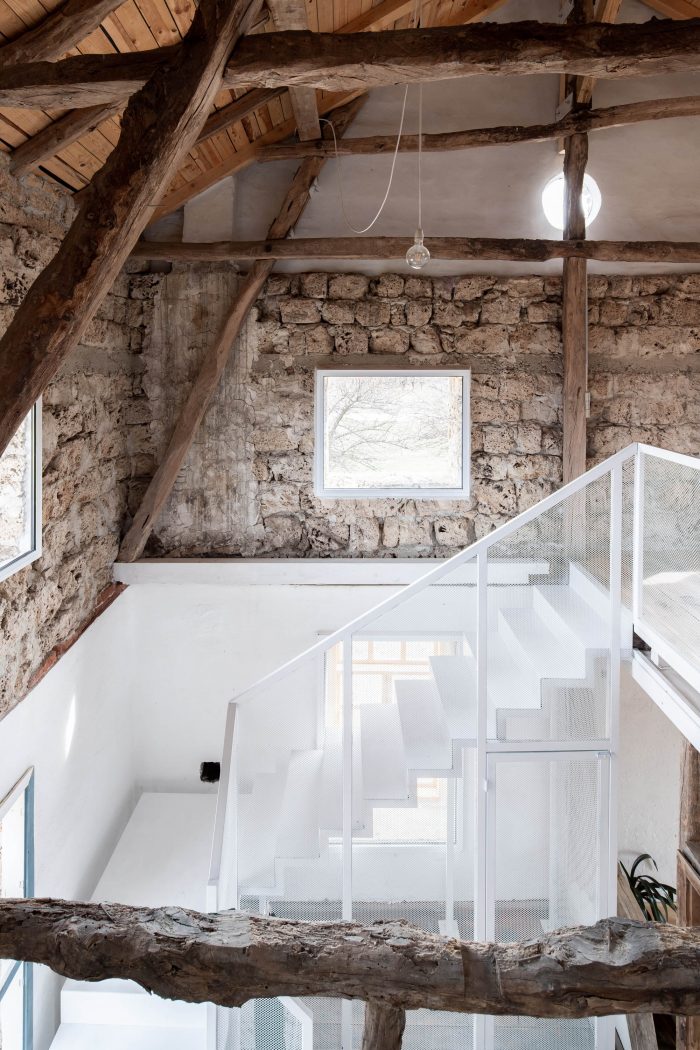 The main design concept for the new intervention was adopting the principle of contrast and balance. Following this idea metal elements painted in white were introduced to the interior as a contradiction to the rustic rough old timber structure. The newly added elements not only enhance the natural look of the old structure but also introduce light to the interior space. A tender metal “lace” was used to frame the banisters and the ascetic furniture.