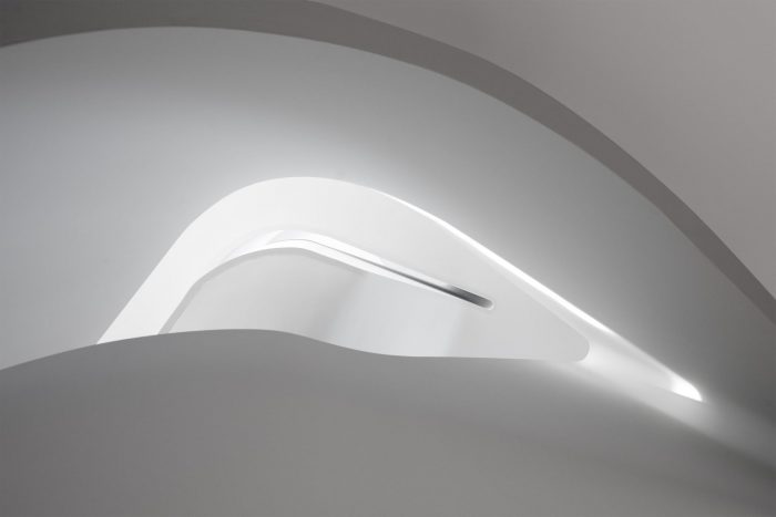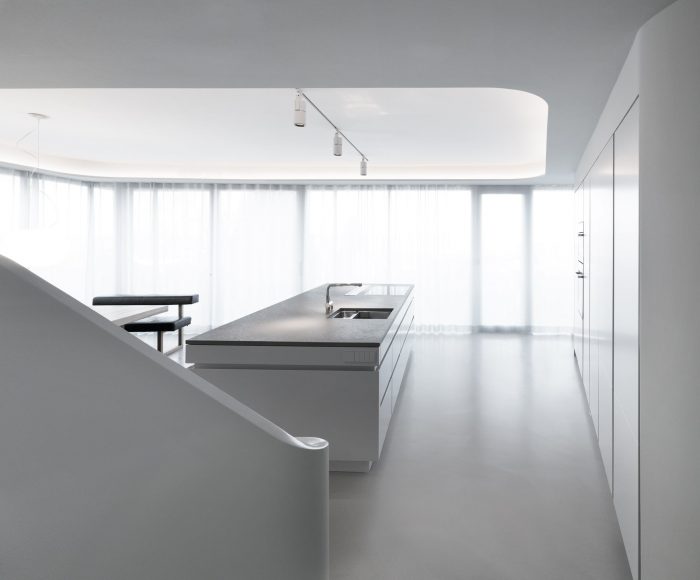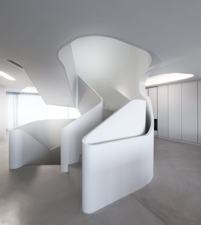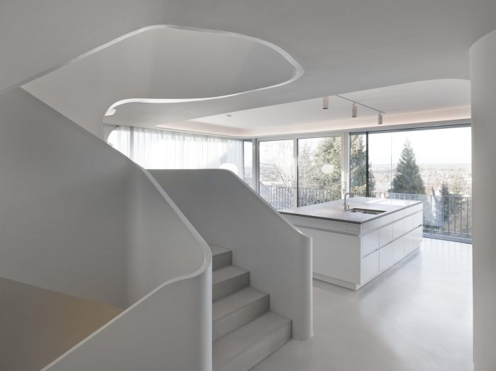 The new, 4-person family home is divided into an elevated ground floor with entrance area, utility room and spa, and a second floor with an open, flowing floor plan containing the living, dining and kitchen areas. Full-height glazing provides a free view of the valley and terrace looking over the garden area. Upstairs are the sleeping areas, dressing rooms and bathrooms. The central design element is a sculptural staircase that connects all three levels.
