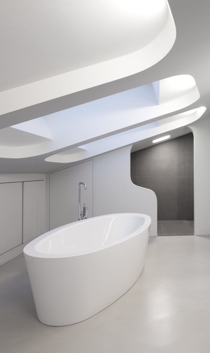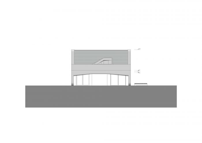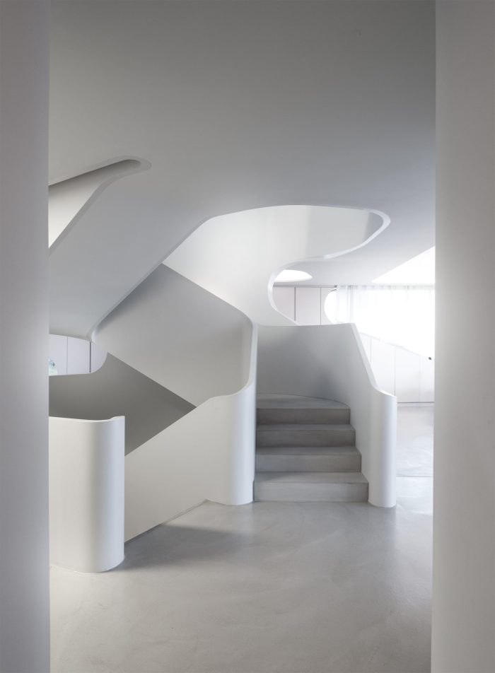 The house was built as a reinforced concrete construction. The facade consists of one heat-insulating compound system and an aluminum and glass facade. Slats and anti-glare sheeting provide integrated sun protection, protecting it against heat. All of the lightweight partition walls inside are made of drywall. The floor is a seamless layer of screed. The roof with the deep, recessed balcony was built with pre-weathered zinc plate cladding and is fitted with solar panels. Outdoor paved areas were realized as tartan surfaces.
