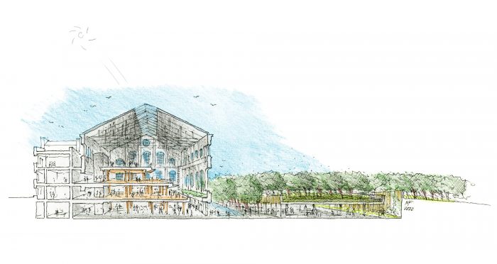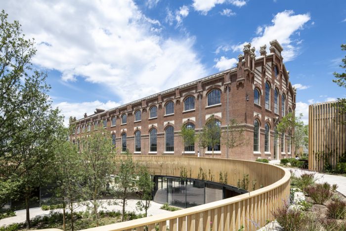 The lightweight structure inserted inside the space is made from sustainably sourced timber from local forests and allows for spatial flexibility, while also integrating lighting, ventilation and other services. The timber structure will save more than 1,600 tonnes of CO2 and is recyclable and demountable. A central skylight brings natural light to the interior, reducing the need for artificial lighting, while the glazing incorporates photovoltaic technologies that generate electricity.