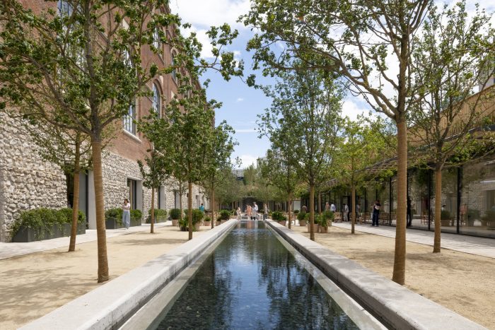 One of the most sustainable projects by Foster + Partners, the project was presented by Chris Trott, Head of Sustainability at COP26 in Glasgow as a case study for the World Green Building Council. Using the concept of Ecological Footprint, the impact of the project was quantified and improved across all aspects of the development; its carbon footprint has been carefully measured and controlled. The design reduces embodied carbon by 25 percent when compared to a new build over the whole life of the project, while making allowances for future refurbishment. The operational energy is calculated to be 35 percent below normal expectations.