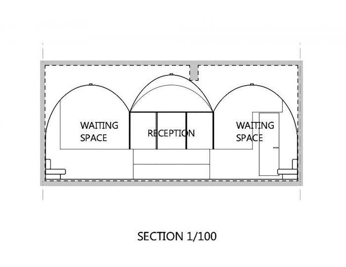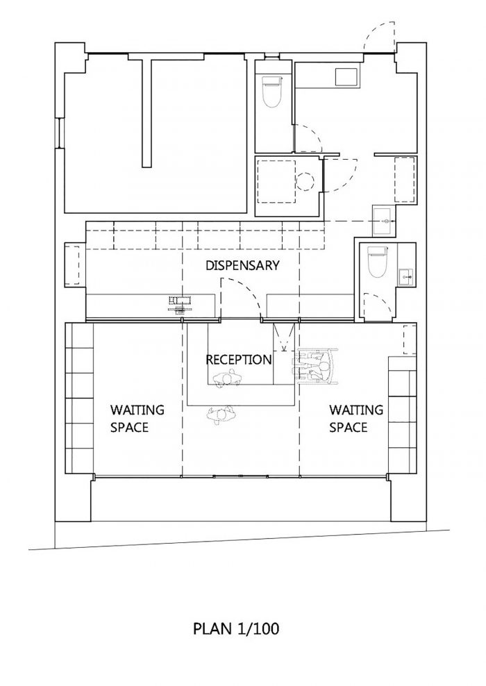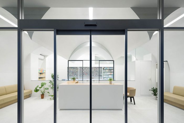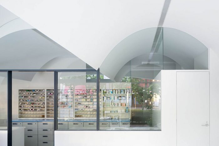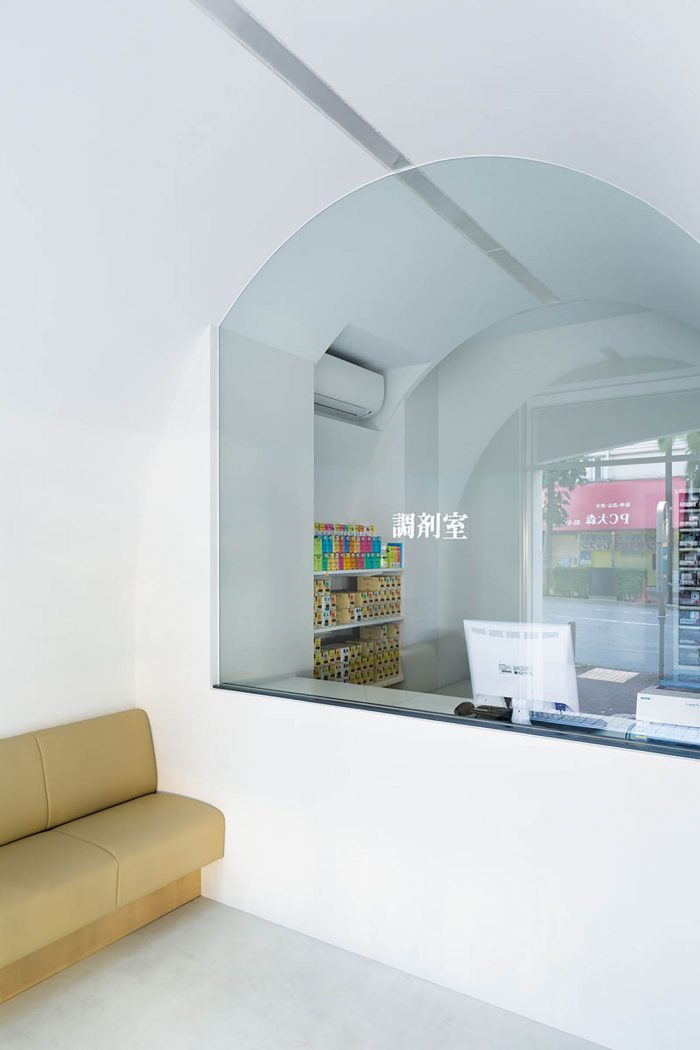 The glass partition in the middle of the pharmacy separates it into two parts, front and back, customers’ zone and dispensing zone. And the three-vaulted shape gently indicates reception and waiting space for patients.