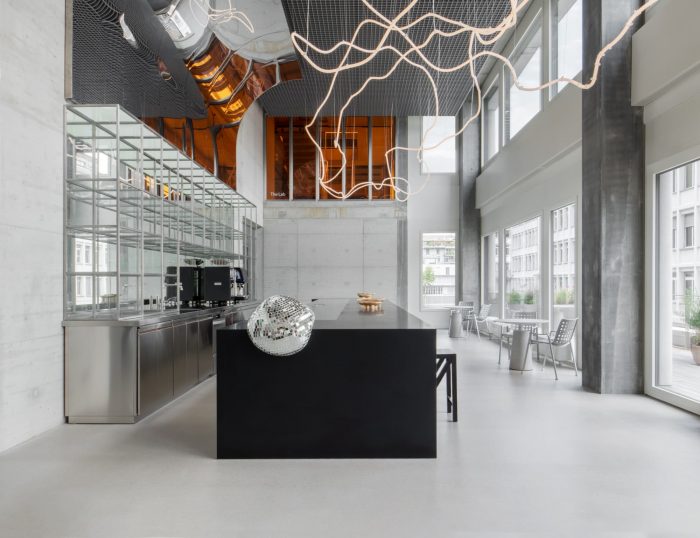 A pine tree is foraged and hung in the opening between two floors in the forest neighbourhood. In the bar a three dimensional tracking of a mountain run is manifested as a neon tube installation hovering from the ceiling. Topographic maps of the surrounding mountains are translated to a custom pattern for carpets and upholstered furniture in the conference area. Lunch meetings can be held in the glass block greenhouse filled with plants next to the canteen. The food served within On labs is plant based and the roof top garden offers plenty of herbs, berries and fruits.