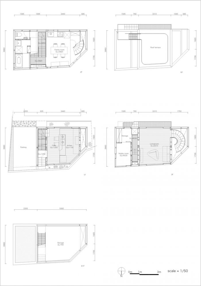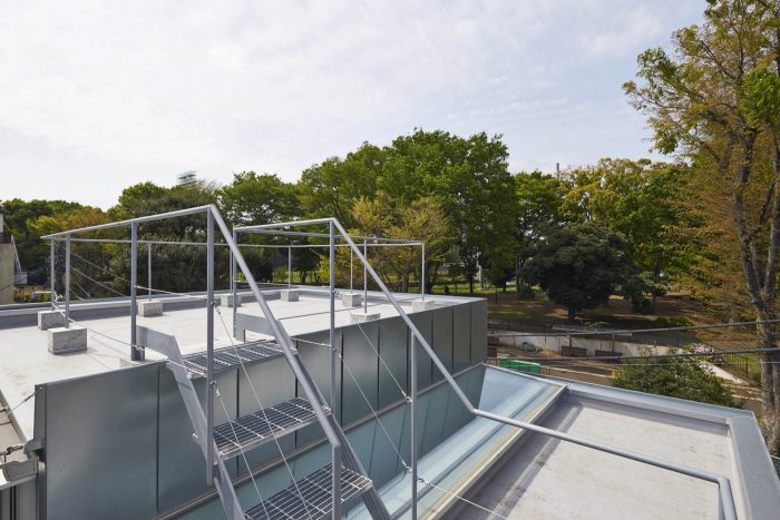 The first floor, the café, is raised from ground level by 1.1 meter to be aligned with the park level to have pleasant atmosphere of the park and to provide visibility from the park. It is also advantage to make the basement floor with less excavation. On the second floor, a public lavatory and a transformer station come into sight. So the floor has fewer windows from outside but has two skylights. At the top floor level, by building volume regulation, a volume of the south side house has setback. So the floor can have both north and south views. On the rooftop, you can feel as if you were at the tree top.