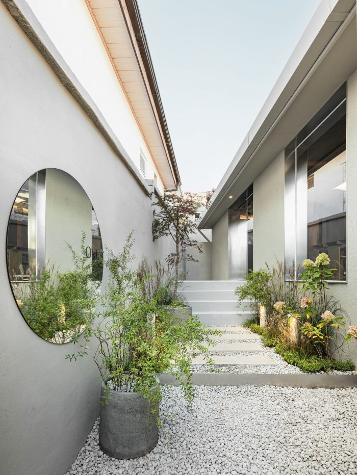 楼梯旁边的石砖、混凝土板和花岗岩是自然的,突出了韩国的美。最大的修饰点是附着在内置长椅一侧墙壁上的麻。使用传统的韩国布,传统的木柱,和天花板。我想表达的是对比性的优雅。使用frp的墙面感觉就像韩国的纸,通过间接照明刻上了食物。
