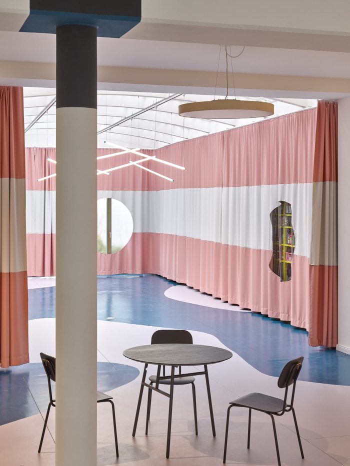 The spaciousness of the room is emphasized by a flowing organic pattern painted on the linoleum floor. The curtains with window holes serve to separate the space, reducing sound and concealing storage. The kitchen is also, designed as a counter in the room, inviting everyone to join in.
