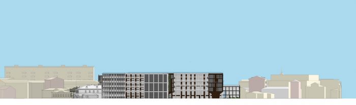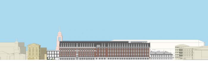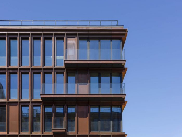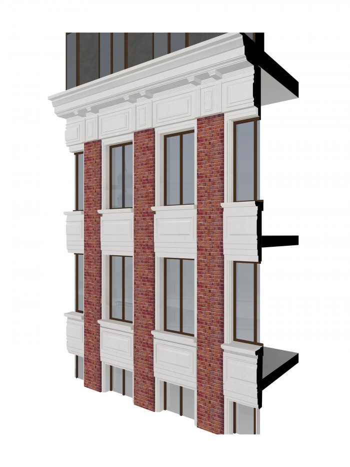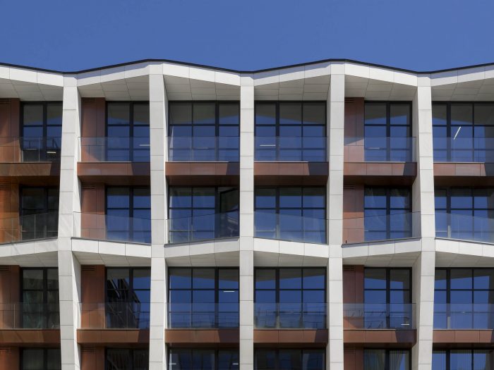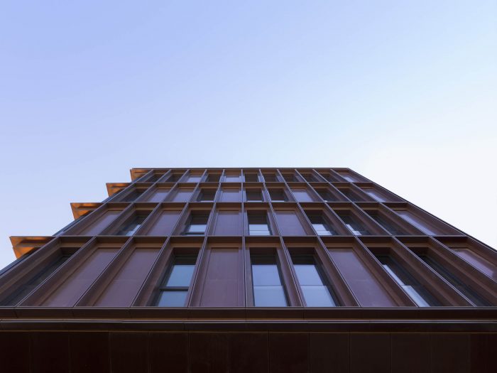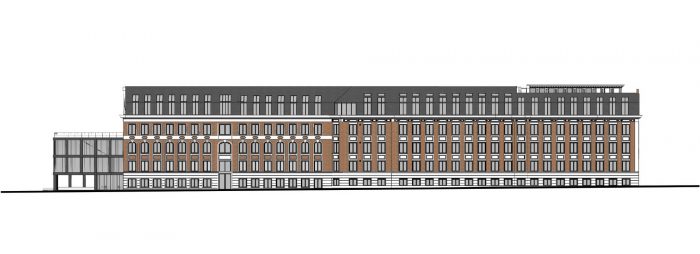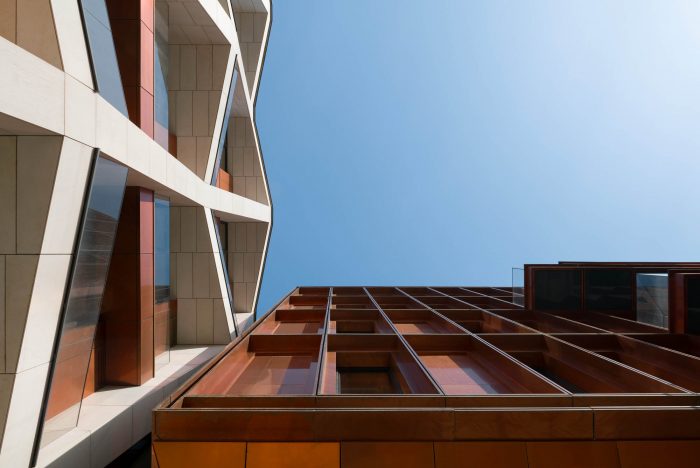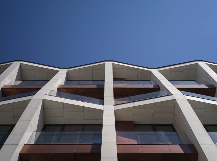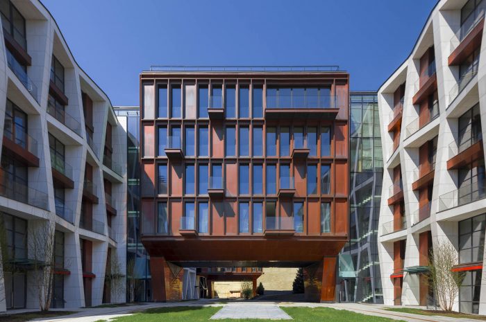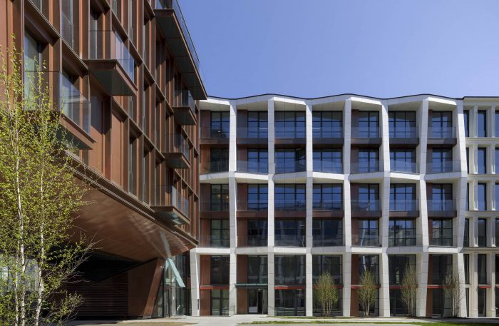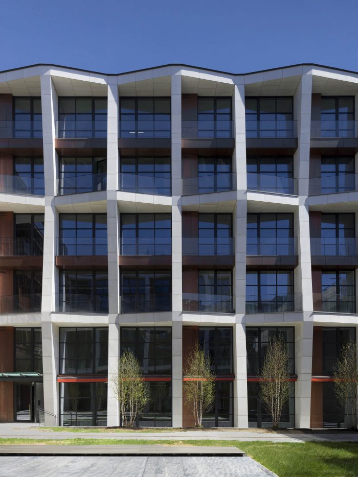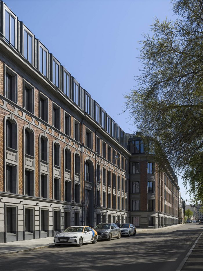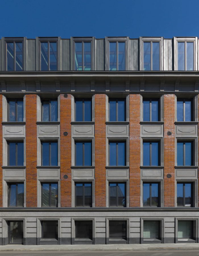ORDYNKA project is designed pragmatically, divided into separate objects to address the complexity of hosting such a large structure in the historic city center. To do so, a universal module was used in planning the facades of all buildings. The original facade faces Malaya Ordynka Street, hiding a modern spacious courtyard formed by two linear volumes with 3D facades, interconnected by two raised bridges. The facades are clad in contrasting shades of light stone and dark metal.