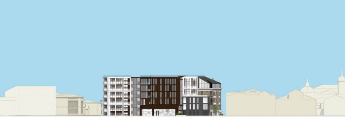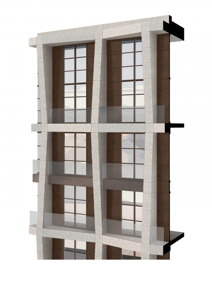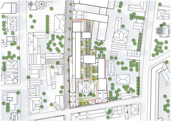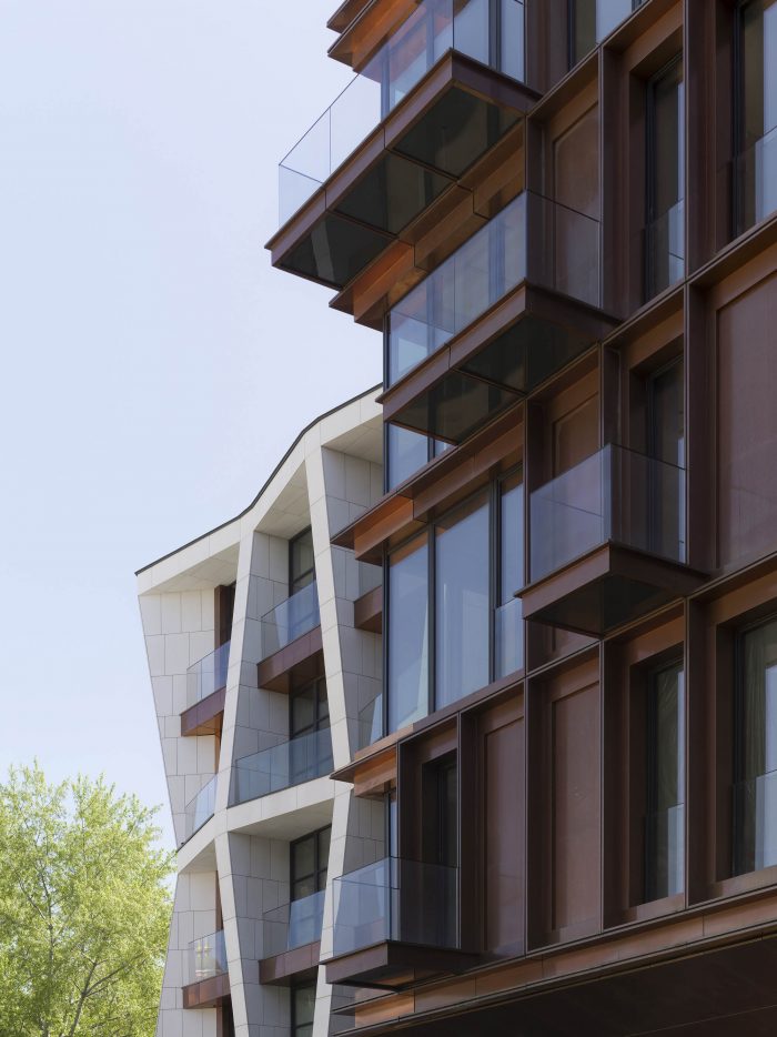 The wavy geometric appearance is created with a simple movement of the planes in-ward and outward, forming a regular pattern of "waves". The main feature, the “heart” of the project, is a spacious, linear internal courtyard, unique for this very dense and bustling part of the city. To transform the courtyard into a green, tranquil space, two of the buildings were elevated with the use of stilts. A serene yet modern oasis is achieved by way of landscaping with water, birch and apple trees, cereals, and objets d’art. All entrances to apartments face the focal point of the courtyard – the restored rear façade of the historic mansion, creating a sense of place and community for the residents.