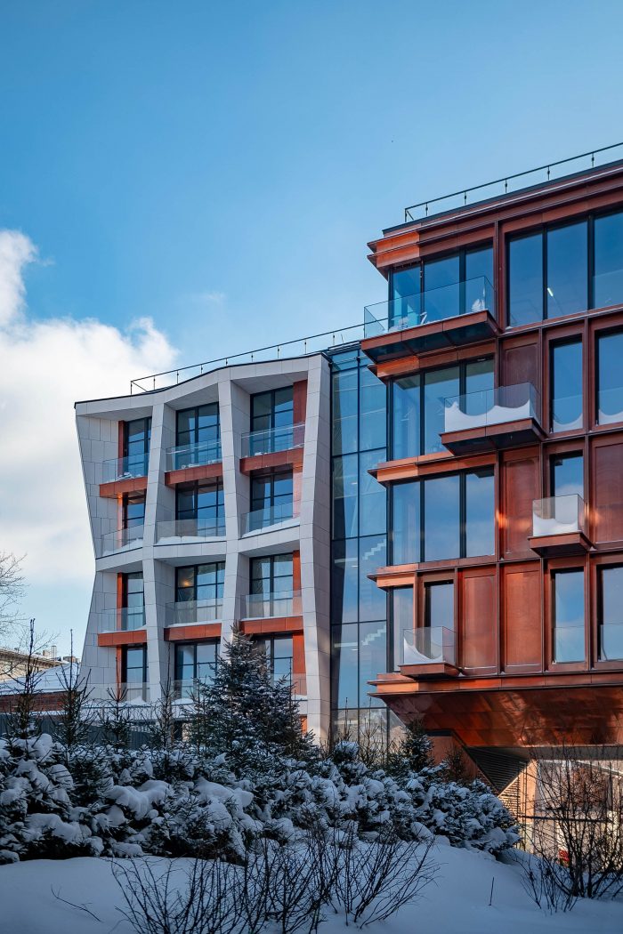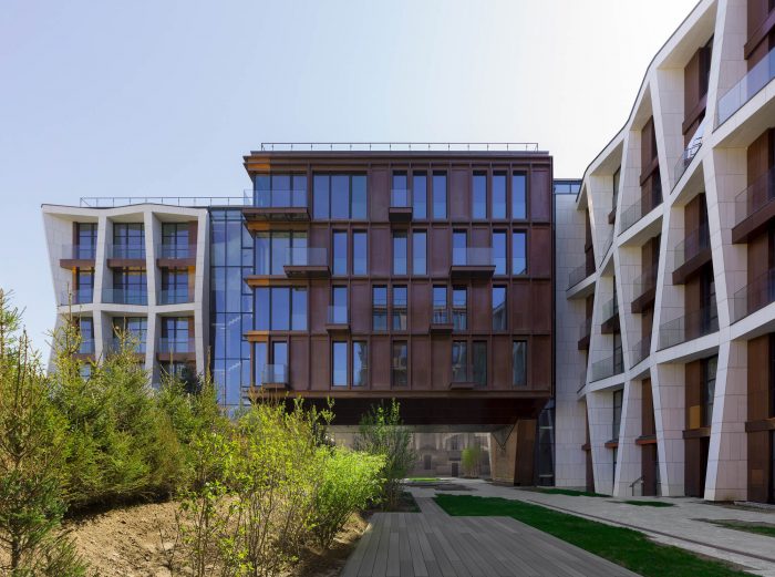 In contrast to the original buildings, the facades facing the courtyard have an emphatically modern design, with polylines, panoramic windows, large modules of white architectural concrete, natural stone, and anodized copper. These elements give the development an unequivocally modern character. In addition, ORDYNKA features a carefully restored 19th-century merchant mansion, specifically a classic manor house with a portico and two outbuildings.