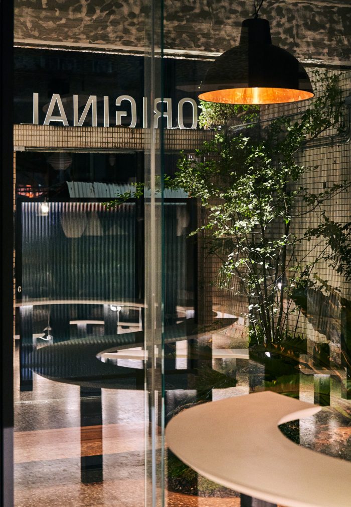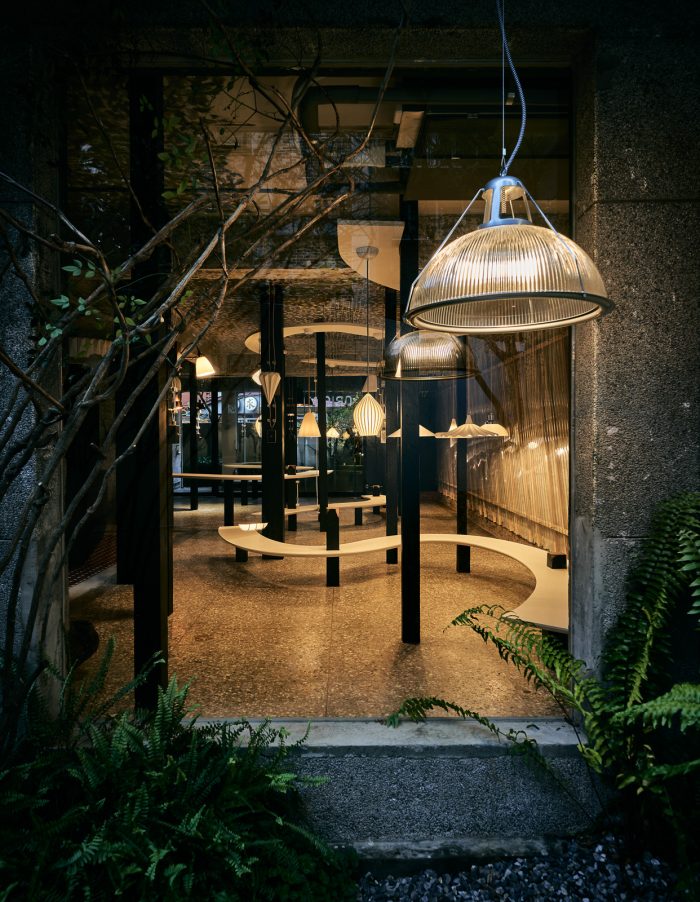 东方意象。除了自然,附近丰富的台湾本土意象也激发了我们的灵感,在设计初期就将东方的印象和纹理与西方的照明工艺结合起来,用于新的展览空间。经过深思熟虑,我们决定借助东方的绘画技巧来呈现自然的感觉。东方绘画中常见的 "散点透视 "是主要的设计方法。所有的景物都堆积在一个空间里: 画面中的森林和台湾的传统砖房;前院和后院新种植的树木和花盆也是风景的一部分,这样人们可以在空间中感受到自然和季节;从外面延伸到屋内的植物和石头与周期性材料相对应; 夜幕降临时,小巷对面的宫殿里亮起的红灯笼(东方灯)和展厅里的西方灯光通过玻璃反射出连续的视觉感,所有这些都是利用散点透视的概念在空间里重叠设计的。