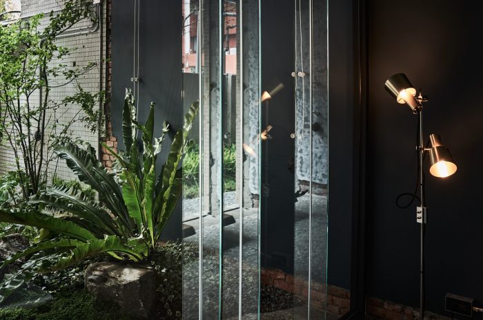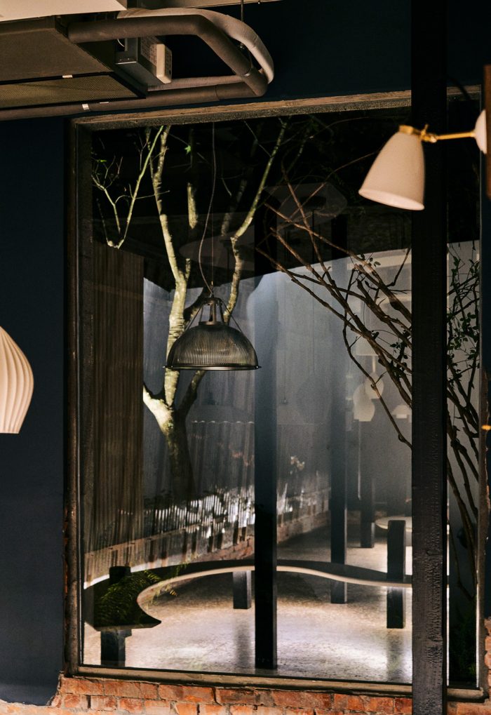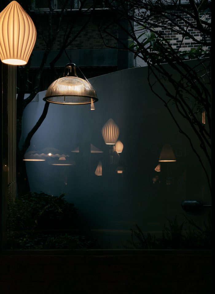 Eastern Imagery. Aside from nature, the rich local imagery of Taiwan in the neighborhood also inspires us to combine oriental impressions and textures with western lighting craftsmanship for the new exhibition space early in the design process. After careful thought, we decide to leverage eastern painting skills to present a sense of nature. The "scattered perspective", a common technique in eastern paintings, is the main design approach. All the scenery is stacked in one space: the picture of the forest and the traditional brick house in Taiwan; the newly planted trees and pots in the front and back yards are also part of the scenery so that people can feel nature and the seasons in the space; the plants and rocks extending from the outside into the house correspond to the periodic materials; the red lanterns (oriental lights) lit up in the palace across the alley at nightfall and the western lights in the exhibition hall are reflected through the glass in a continuous visual sense, all of which are designed to overlap in the space using the concept of scattered perspective.