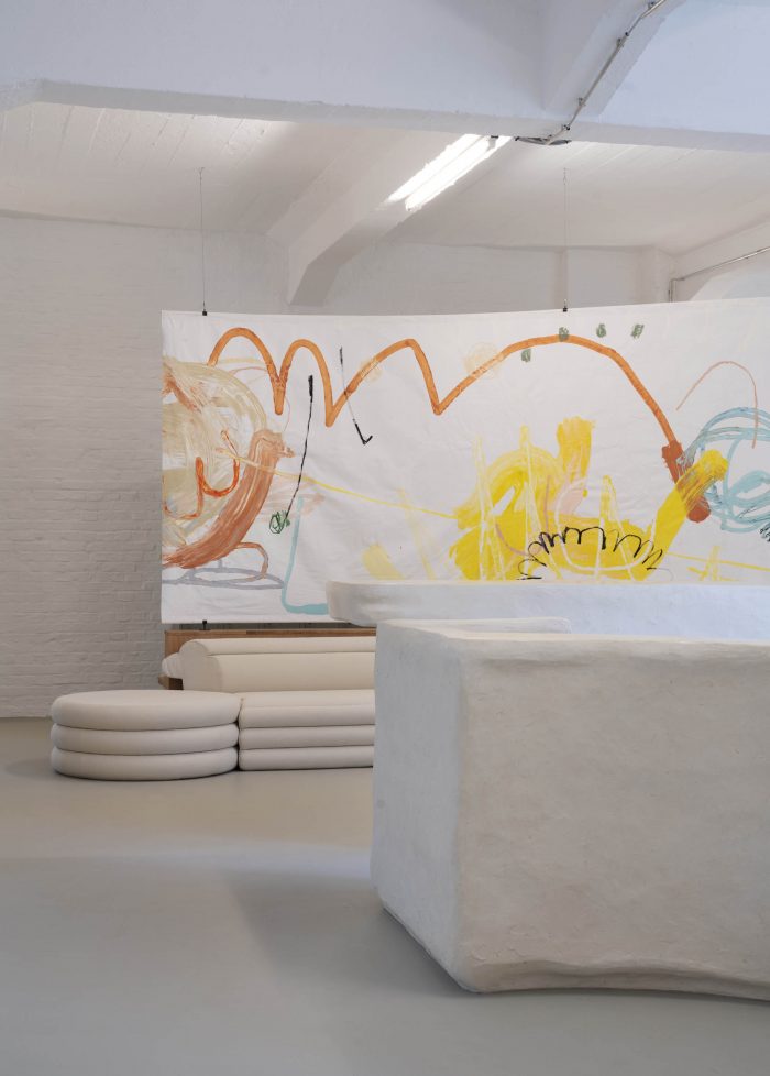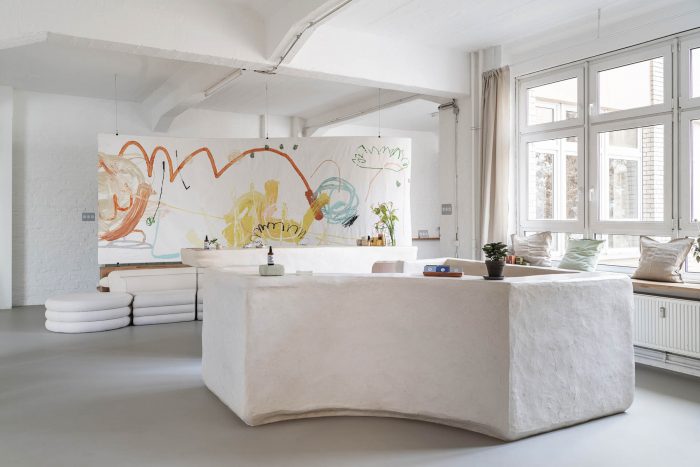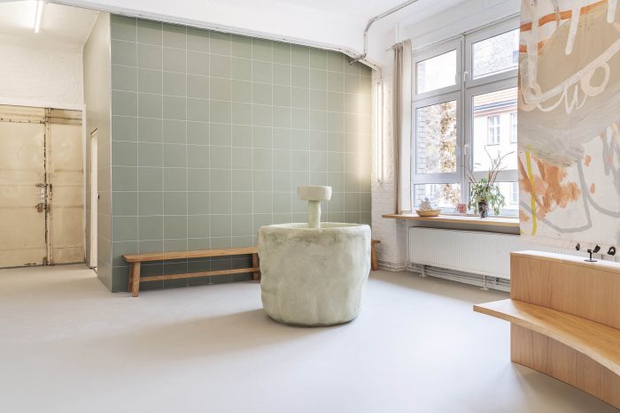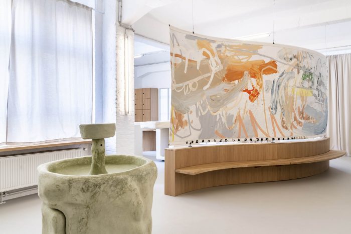 The color palette is muted, with a focus on materiality and texture created in collaboration with two emerging artists. The front desk and water fountain were created in collaboration with Yasmin Bawa, using a custom process of a hempcrete structure finished with pigmented lime plaster to create the surface textures. The large-scale privacy screen separating the lounge area from the changing rooms was painted by the young Viennese Artist Denise Rudolf Frank.