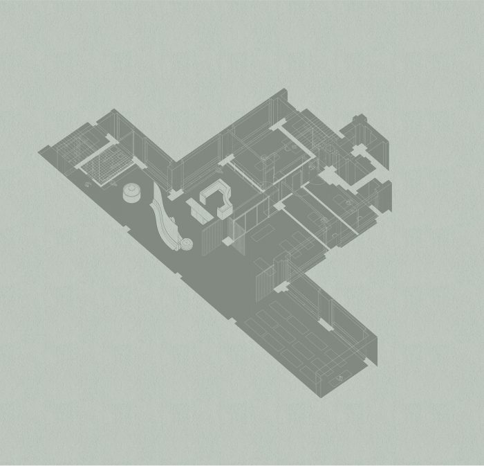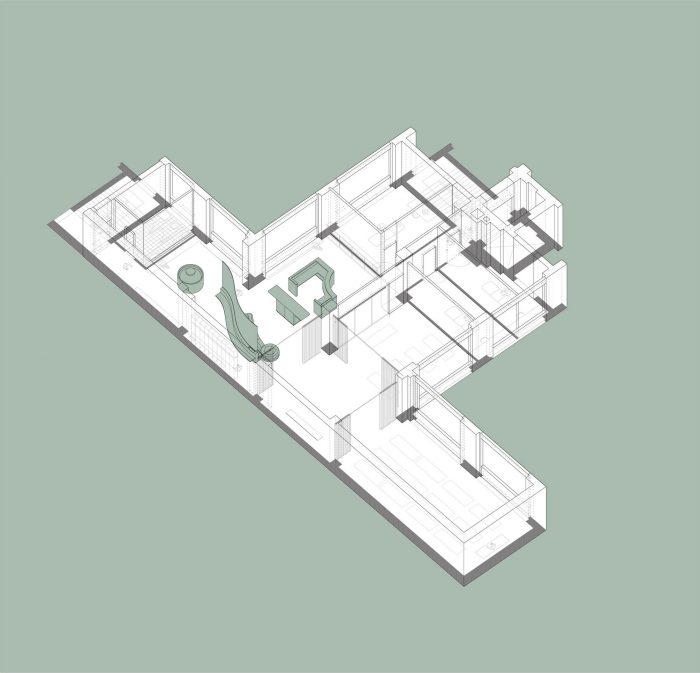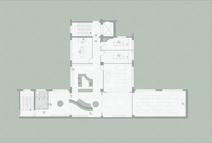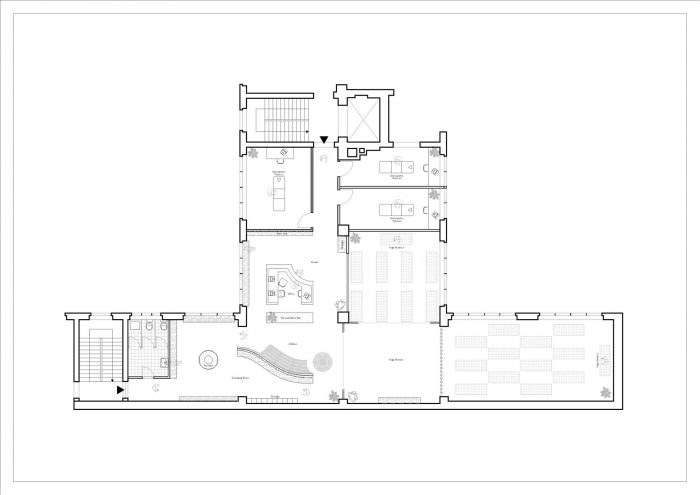 The design of this boutique Yoga studio is based on the idea of flow - a term used in yoga practice to describe a sense of fluid movement and meditation. Within the space, these ideas manifest through smooth transitions between spaces and the extensive use of malleable materials such as fabrics and hempcrete. The entrance opens up onto a large reception area with a central desk doubling up as an occasional bar. A reconfigurable sofa follows the soft curve of a large screen acting as a space divider. On one side a large water fountain reminds visitors to wash their hands while the other side leads into the practice rooms.