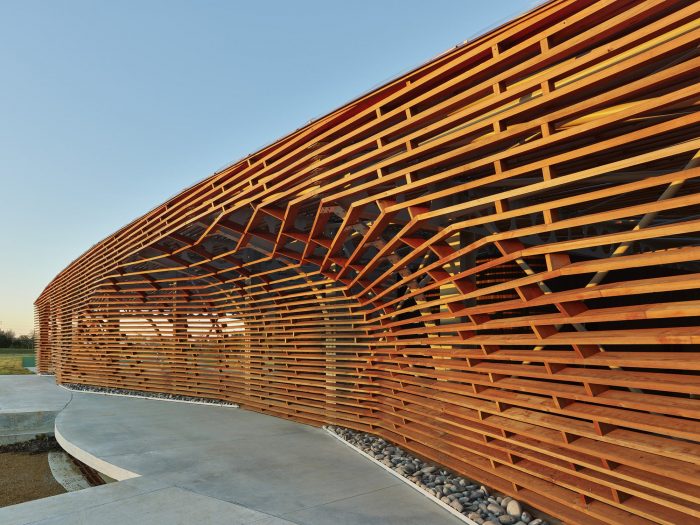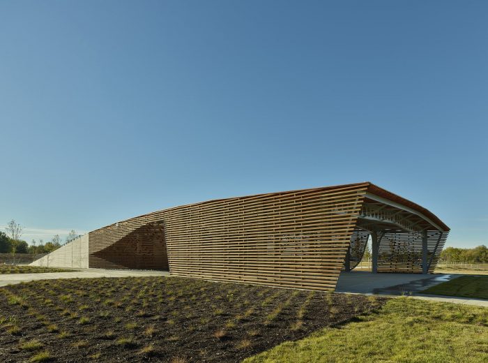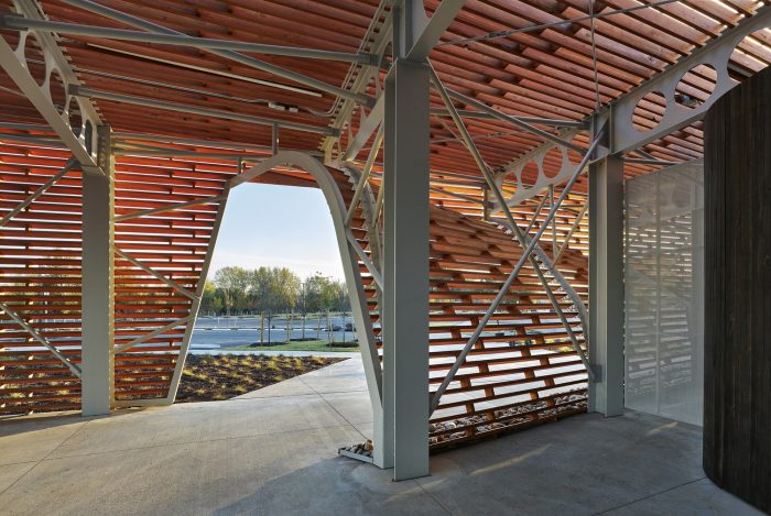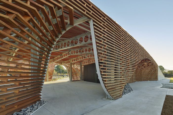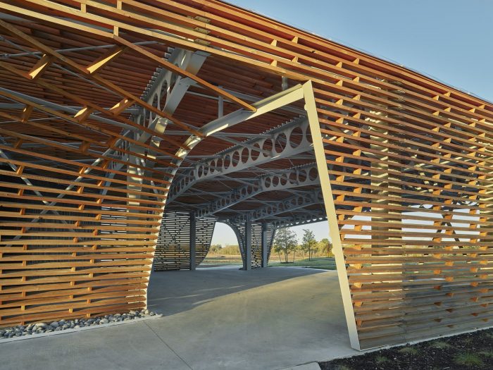The Osage Park Pavilion is a gateway and centerpiece for Osage Park, which resides at the northern end of a small municipal airport in Bentonville, Arkansas. The airport is a playground for unique small aircraft, and this pavilion derives its playful form and structural expression from aircraft wing design. The simple, fluid form lifts seamlessly out of the ground, evolving into a light, airy structure that celebrates natural light pouring through repetitive structural elements and the dynamic, undulating Arkansas-sourced cypress facade.