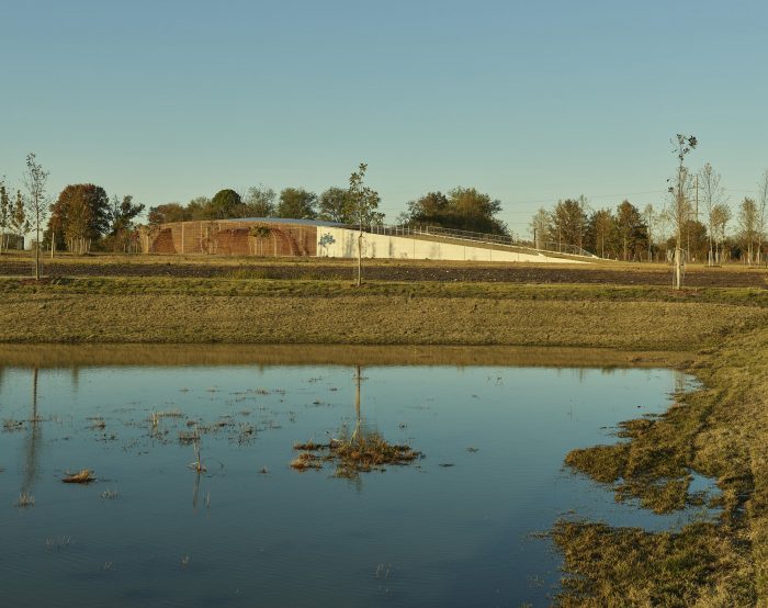 Just as visitors slide through various riparian areas of the park, the pavilion rises from the earth with a clear polycarbonate roof that is truly the 5th facade viewed from the air. This gentle glowing creature is simultaneously part of the land and a gesture to the sky.