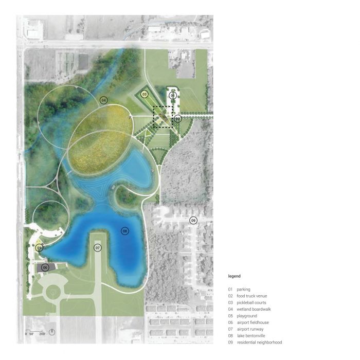 该场地位于小奥萨奇溪流域和大伊利诺伊河流域内。该场地现有的支流湿地系统基本上没有被触动。奥萨奇公园馆位于直接毗邻一个市政机场。根据美国联邦航空局的说法,这并不是一个理想的湿地保护区的位置。这给设计团队带来了相当大的挑战。联邦航空局建议完全清除所有的栖息地,并建议对湿地进行排水。