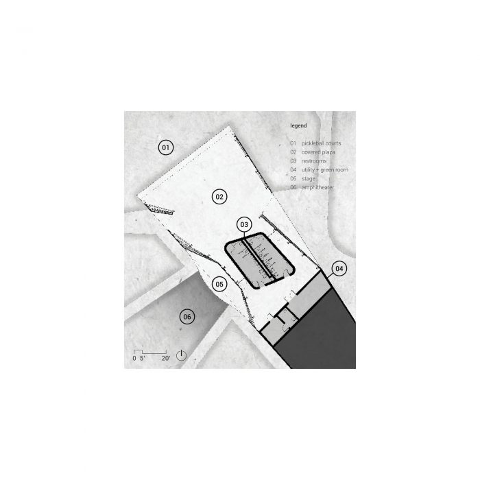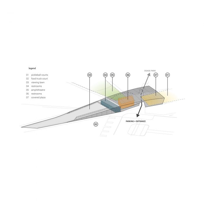 The pavilion acts as a hub within the larger park and contains a covered gathering space, restrooms, a green room, an outdoor stage, and an amphitheater that anchors the eastern edge of the 55-acre recreational area. As the pavilion rises out of the park, the occupiable green roof becomes a viewing platform for watching planes take off and land.
