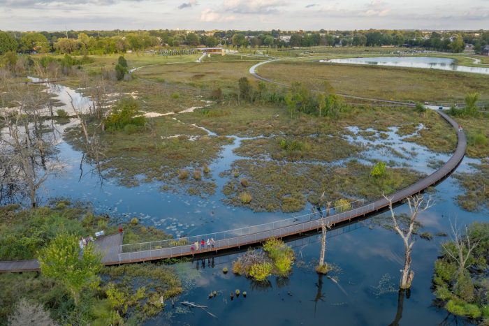 The existing wetlands at Osage Park play several roles, including water purification, water storage, and processing of carbon and other nutrients. Boardwalks are used for circulation throughout the park to preserve existing wetland and riparian areas. Other green infrastructure includes riparian buffers and the introduction of native plants to aid in phytoremediation and restore a more natural aquatic environment.