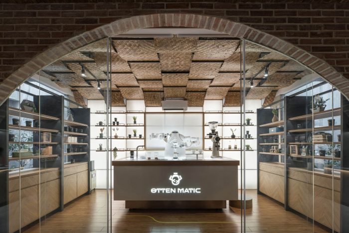 移到主区域,天花板上的传统gedek竹子或竹编与空间融为一体,形成一个强大而大胆的身份。144平方米的开放式空间展示了产品,这些产品沿着墙壁一侧依次陈列。两张定制的桌子是用来品尝的。考虑到施工时间和预算效率,家具是用干墙隐蔽起来的。中心的36平方米的酒吧用木质镶木地板抬高,在空间内创造出层次感和活力。在白色和天然木材饰面的两种色调中,酒吧巧妙地在墙壁和地板的灰色调中脱颖而出。展示柜上的人字形木材饰面,平衡并保持了空间内材料的连续性。吧台后面有一个咖啡机的展示台,这些咖啡机在基座上一字排开。再往前走,是一个15平方米的专用机器人室,为表演性的视觉效果服务—由玻璃围成的独立空间,以拱形砖墙为框架,并以木质镶木地板为高。