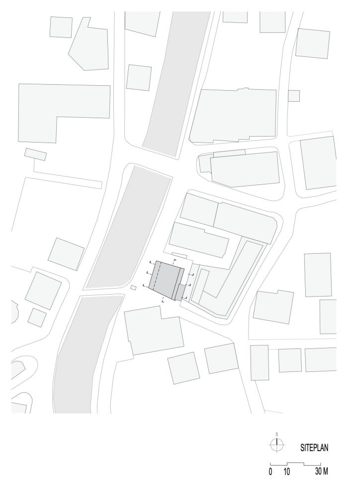 In terms of height and volume, the building reacts to its immediate surroundings by respectfully sinking and rising in correspondence to given alignments, shaping its appearance and orientation in an ideal relationship to the given location. By dynamically leaning forward, the volume formally encloses the forecourt, gaining clearly a prominent role within the town square and symbolically bowing to the guests.