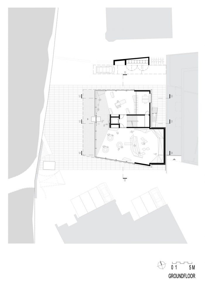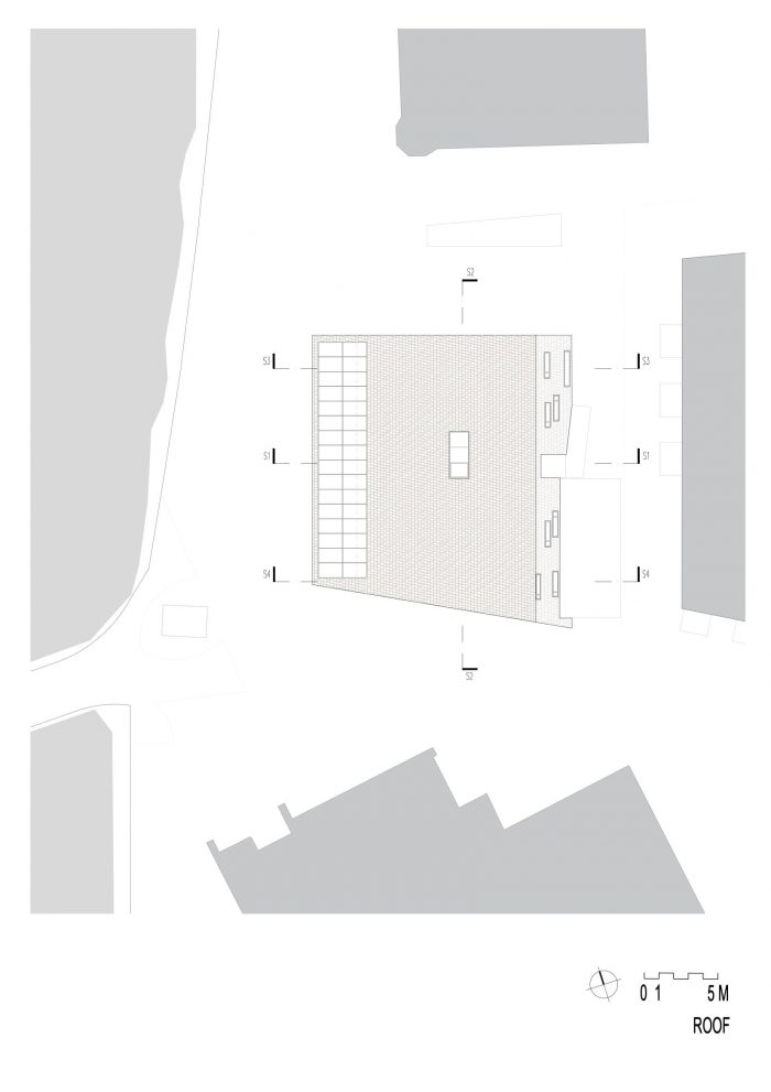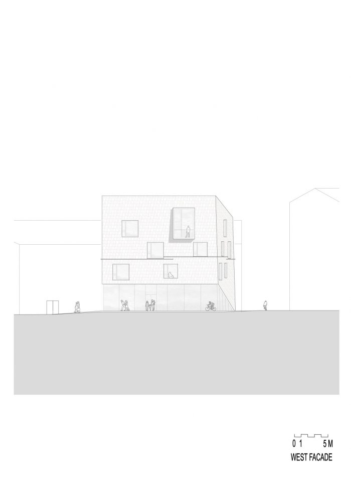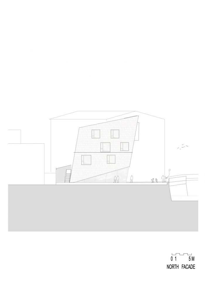 One homogeneous paving material for the forecourt and ground floor blurs intentionally the boundaries between outdoor and indoor, as an inviting gesture to the guests. With a glazed front on the ground floor westside, the façade echoes this open attitude, lifting its wooden shell like an open mouth towards the square and the river.