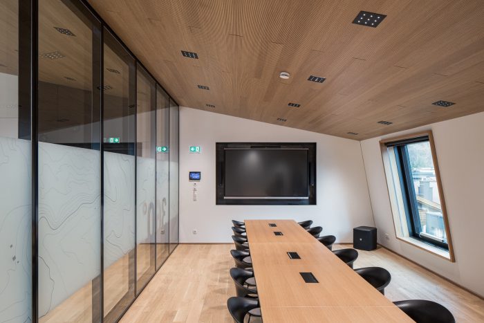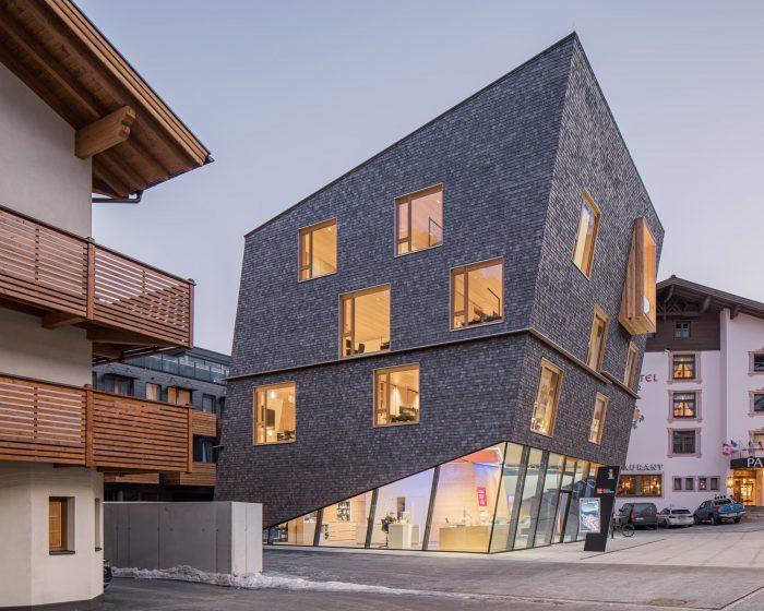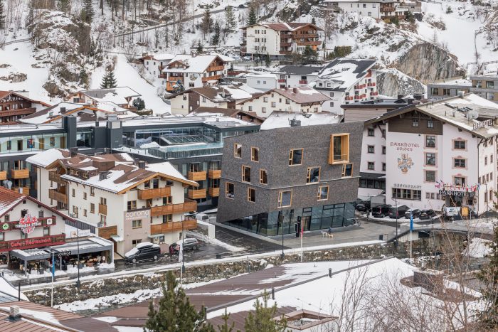 The spacious ground floor, with its high-tech information point and a restrained linear design, reflects the forward-looking strategy of Ötztal Tourism. The outer skin clad in pre-grey larch shingles, full-height-wooden windows, and the open glass façade on the ground floor created a distinctive overall image, outgrowing the surrounding buildings.
