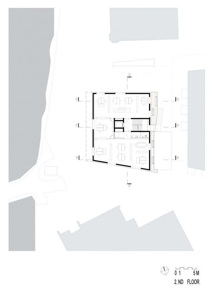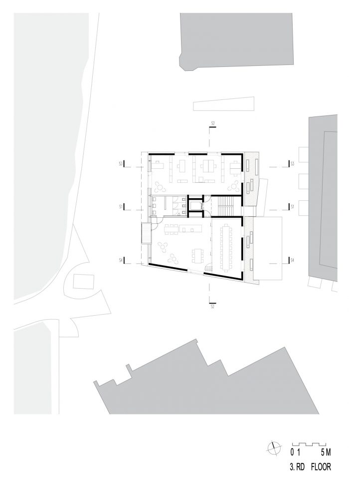 The square can be flexibly reorganized for various events thanks to its formal freedom, while indoor interactive exhibitions present the natural surroundings nearby and their unexplored potential. The building interiors are organized around a central distribution core, with an open staircase and an elevator piercing the interior spaces. Underground car access is provided by the garage of the adjacent hotel.