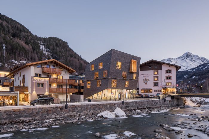 宽敞的底层,高科技的信息点和克制的线性设计,体现了厄兹塔尔旅游的前瞻性战略。外表采用预制灰色落叶松木瓦,全高木窗,以及底层的开放式玻璃幕墙,创造了一个独特的整体形象,超越了周围的建筑。