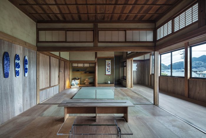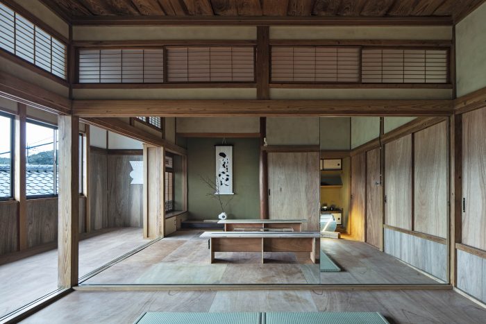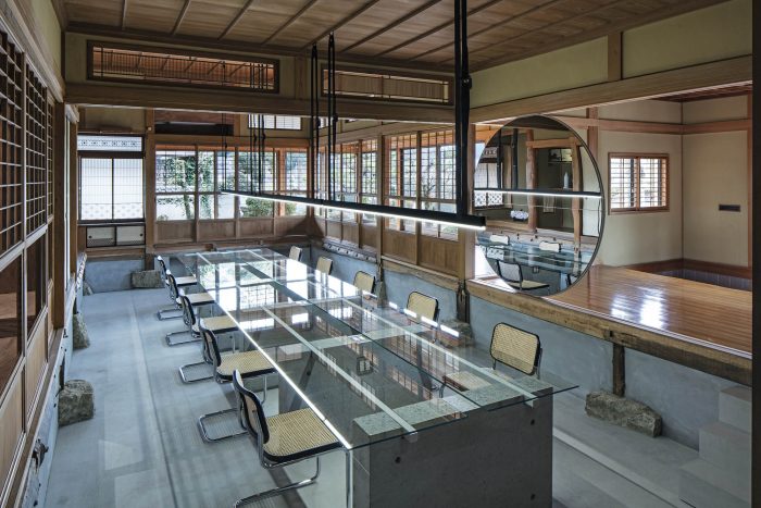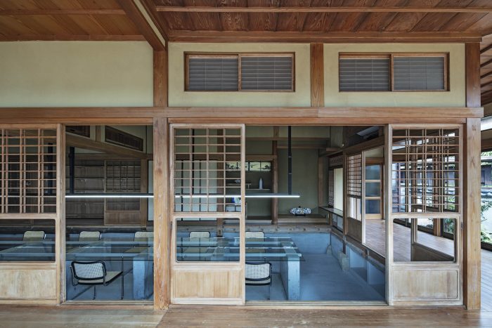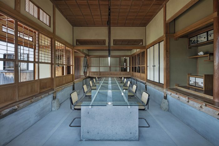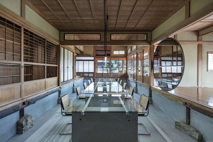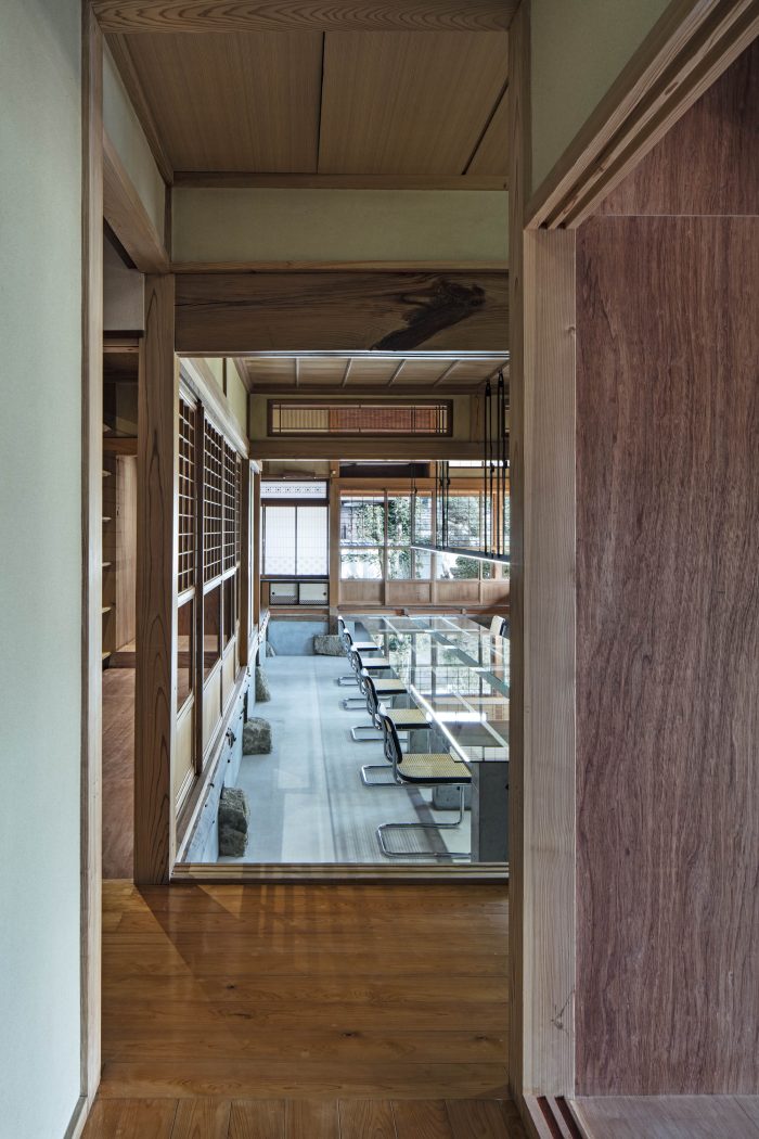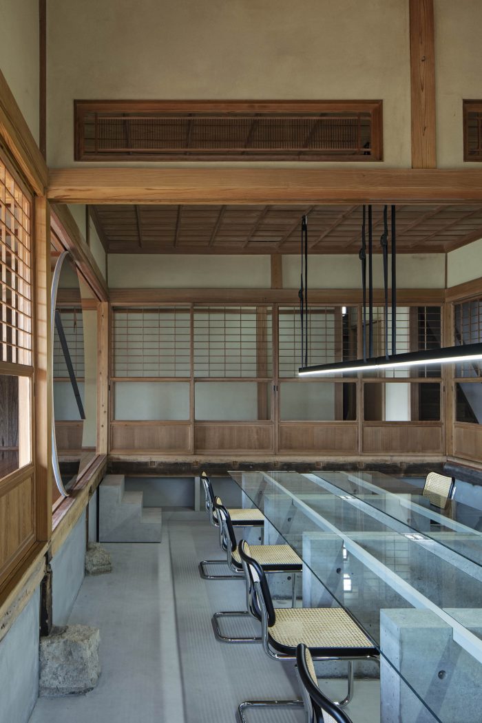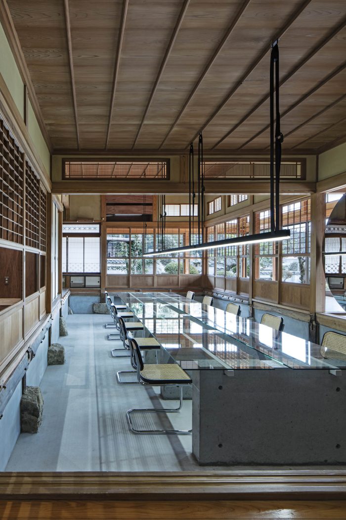 DDAA建议尽可能少地改变现有条件,并拆除铺设榻榻米的房间的地板。地板被拆除,混凝土被浇筑,留下出现的宏伟的石头基座。与混凝土地板一起,在原来地板的高度上的桌子腿也是用混凝土提供的。