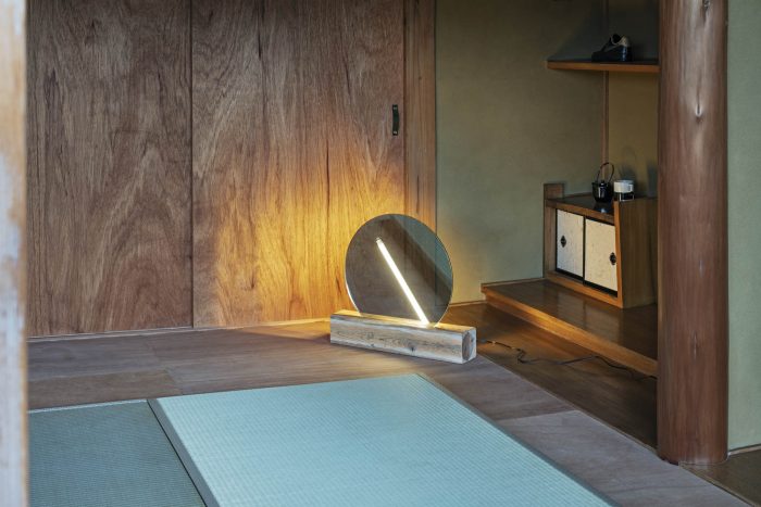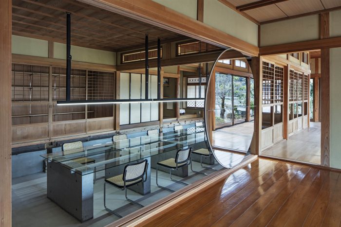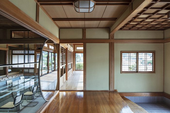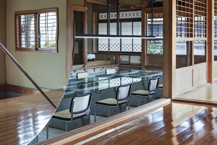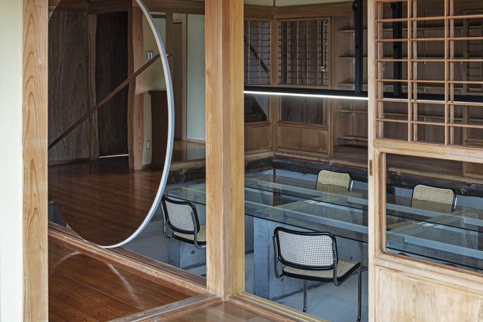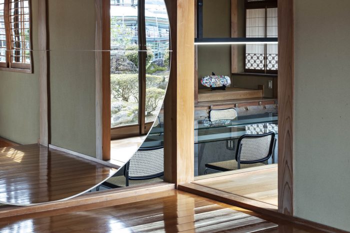 Using a chair often cause damage to the tatami, but removing the tatami solved the problem, and at the same time, the ceiling height was raised as the floor was lowered. All the paper and glass were removed from the yukimi-shoji screens (lattice frame with translucent paper on top and glass on the lower part so that you could look out at the garden when sitting on tatami mats). Since the floor has been lowered, the garden is at eye level when sitting on a chair. The tokonoma (Japanese alcove, which is often decorated with hanging scrolls and other art piece), which came to a relatively high position, also suits the gaze of modern life, where we often sit in chairs. A rolling round mirrored door that also serves as a sign for the entrance was installed on the existing shoji frame.