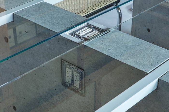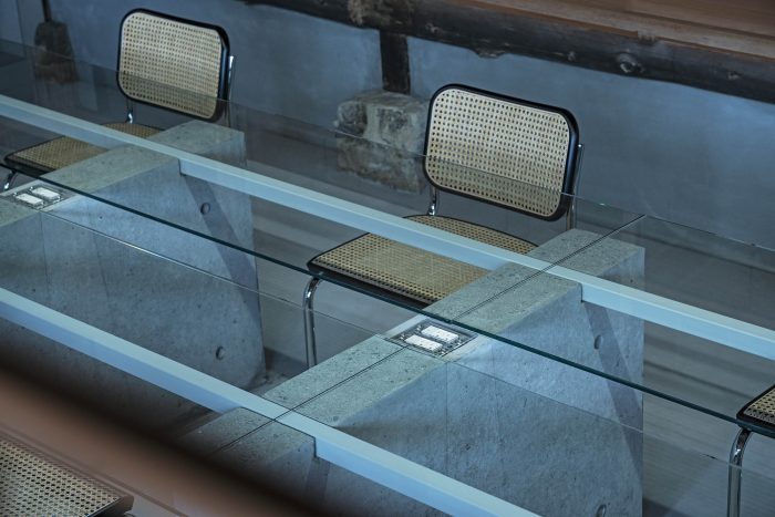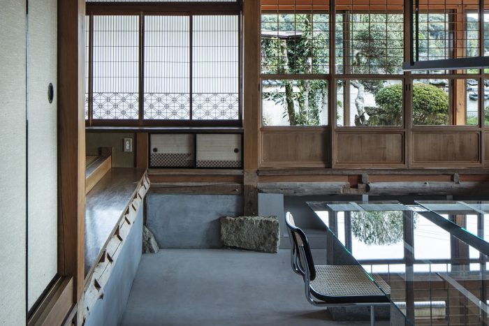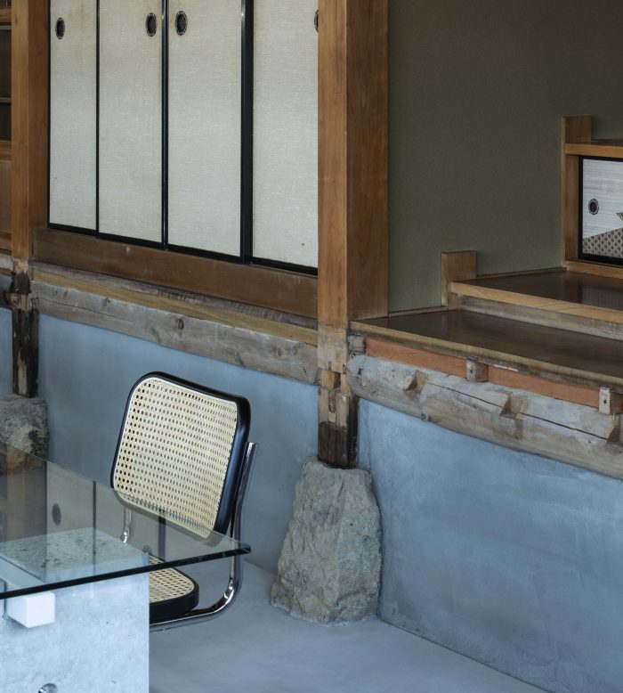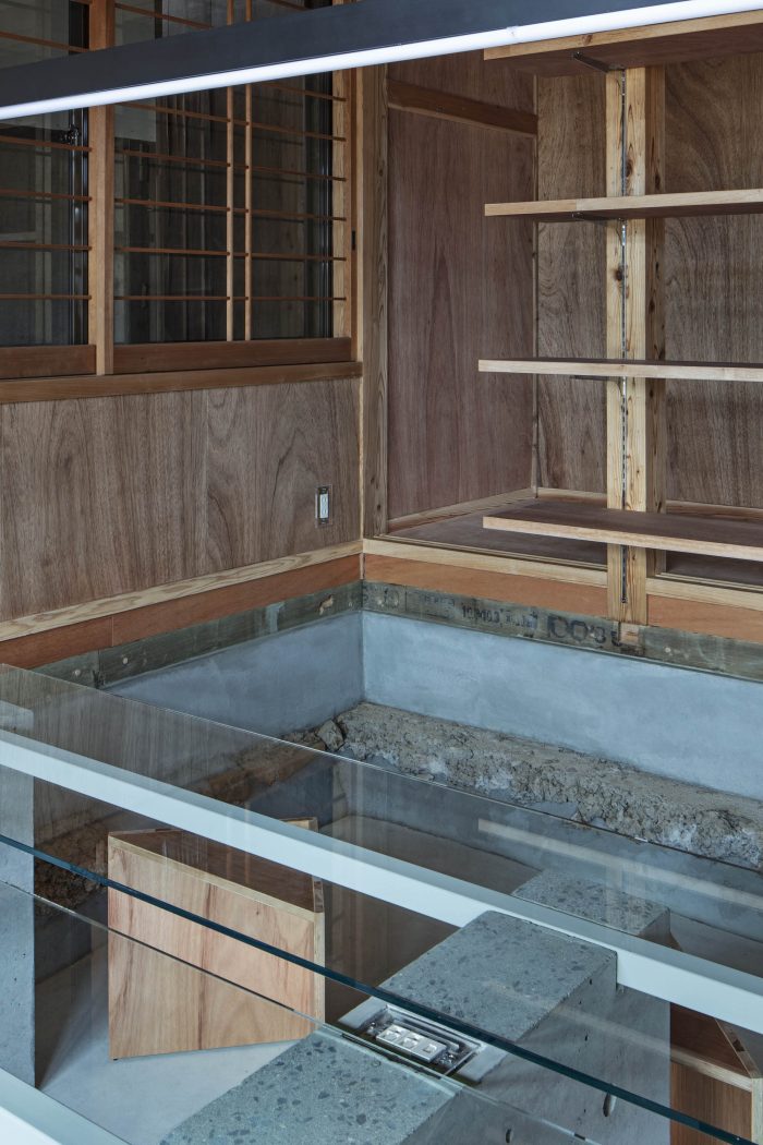 DDAA proposed to make as few changes as possible to the existing conditions and to remove the floor from the room where the tatami mats were laid. The floor was removed and concrete was poured, leaving the magnificent stone plinth foundation that appeared. Along with the concrete floor, the legs of the desk at the height of the original floor were provided also in concrete.