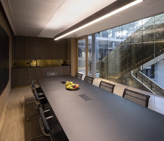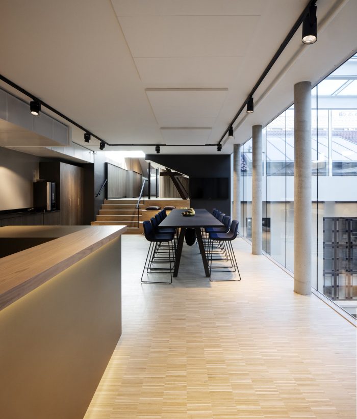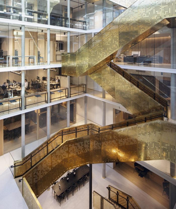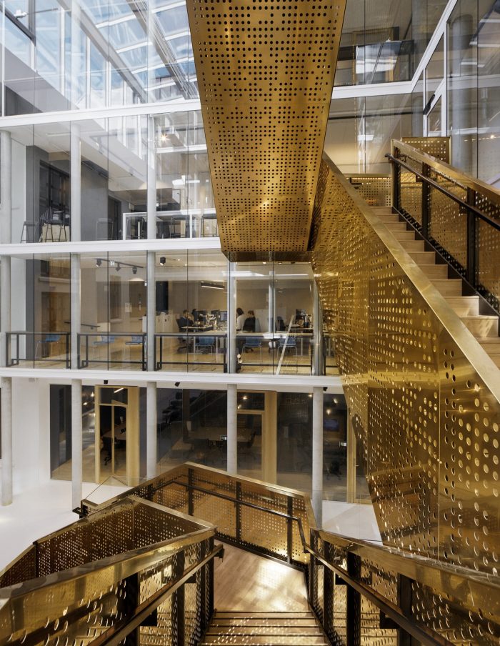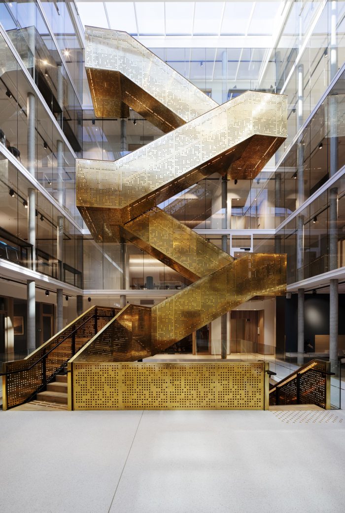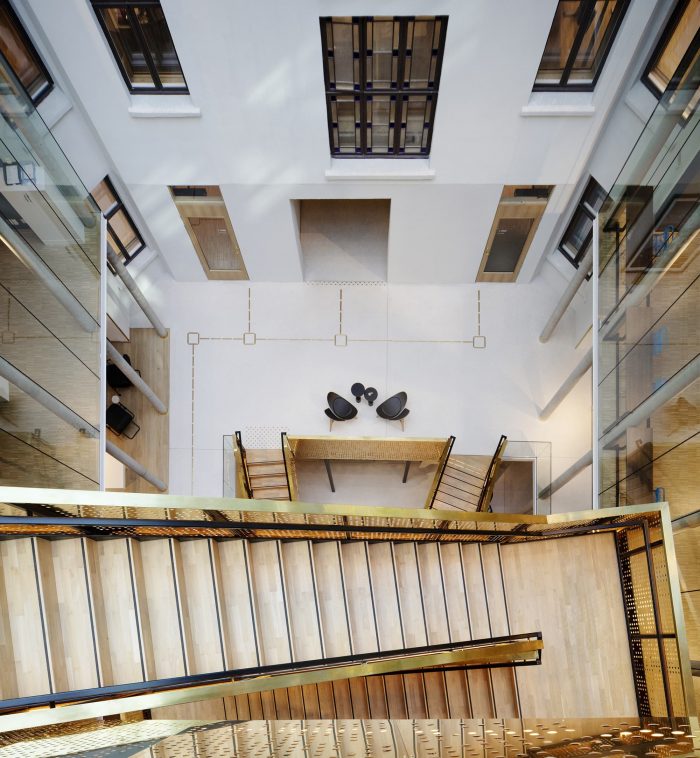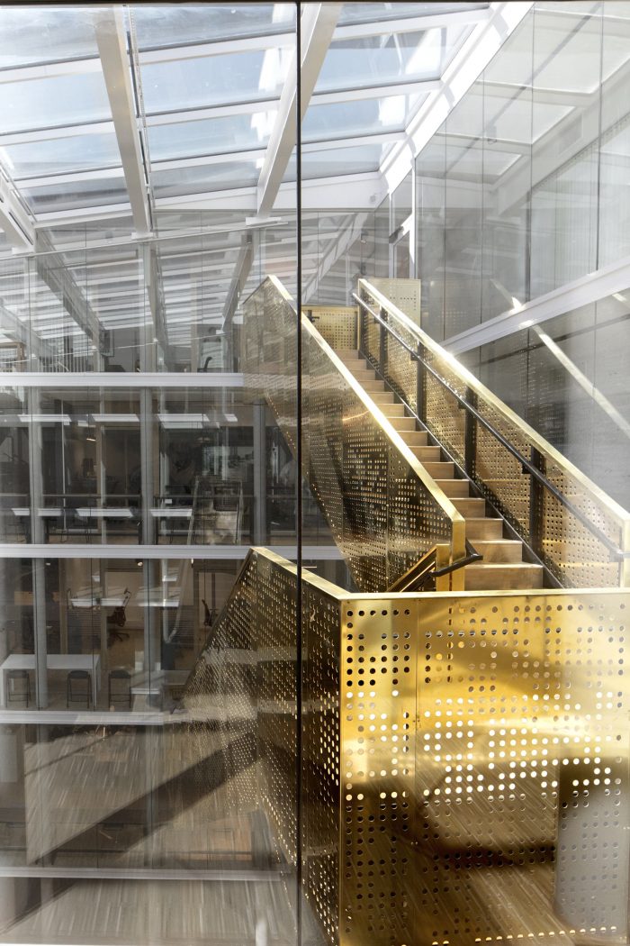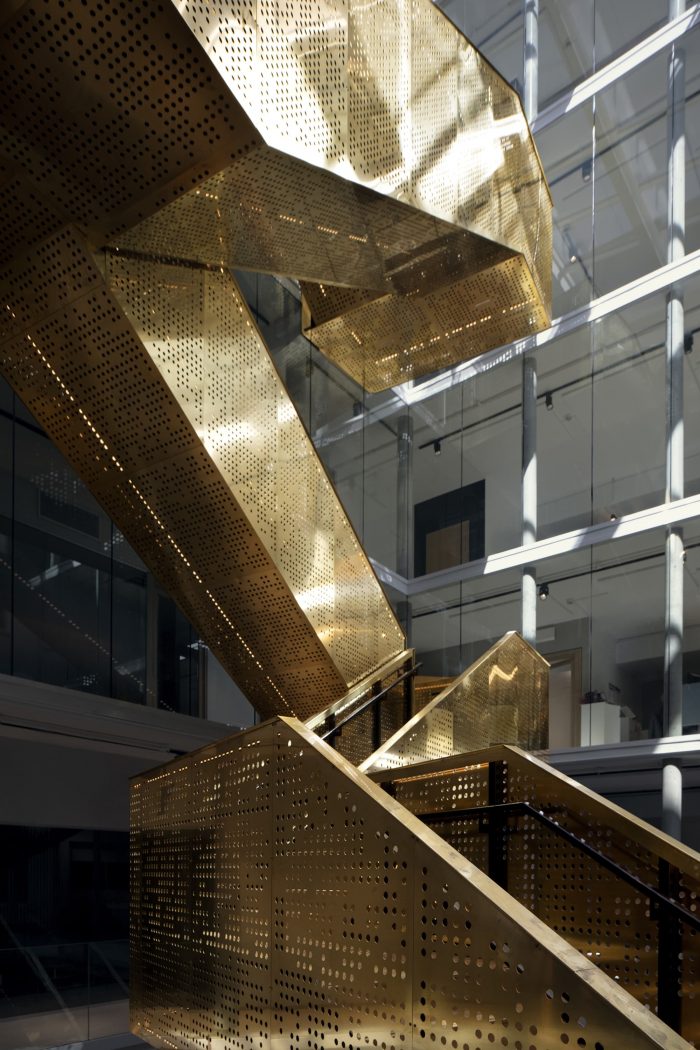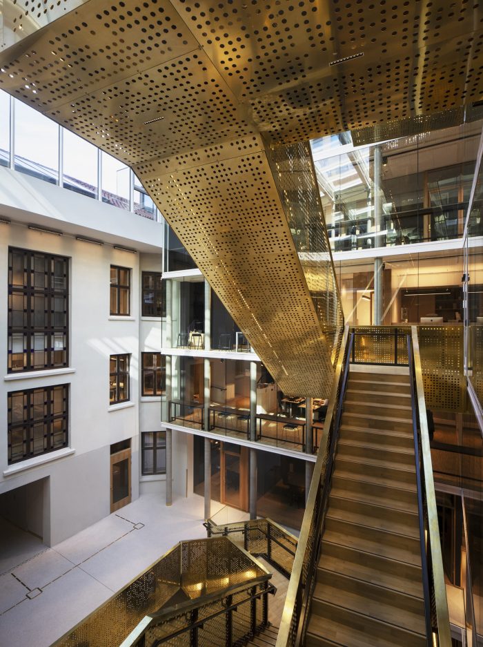 The courtyard is enclosed in the new building as a glass-covered interior atrium, that connects the old and the new building and admits daylight into the office spaces. All functions are accessed via the large, brass-clad main stair that stretches from the underground cafeteria to the roof terrace.