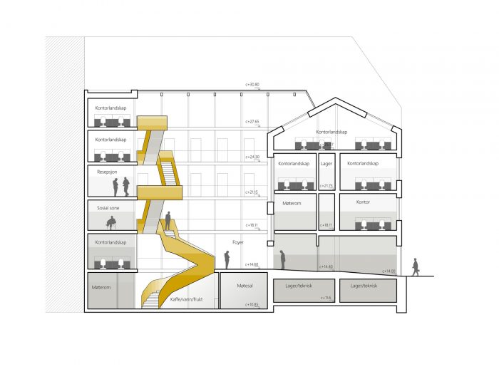 The project is a transformation and complete refurbishment of a listed office building from 1892. The front building toward the street is completely rehabilitated, and the wings surrounding the inner courtyard are demolished and replaced with a new structure.