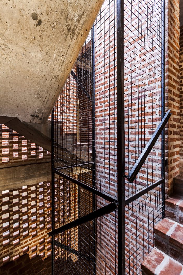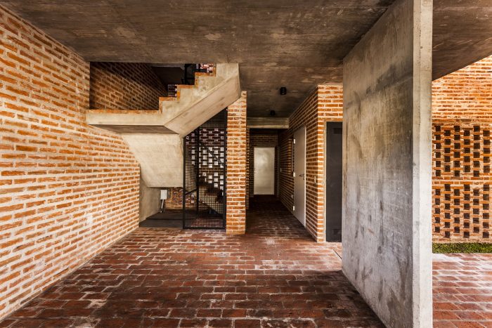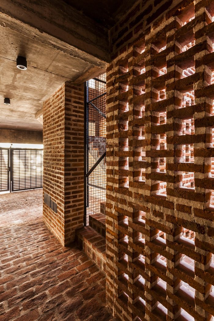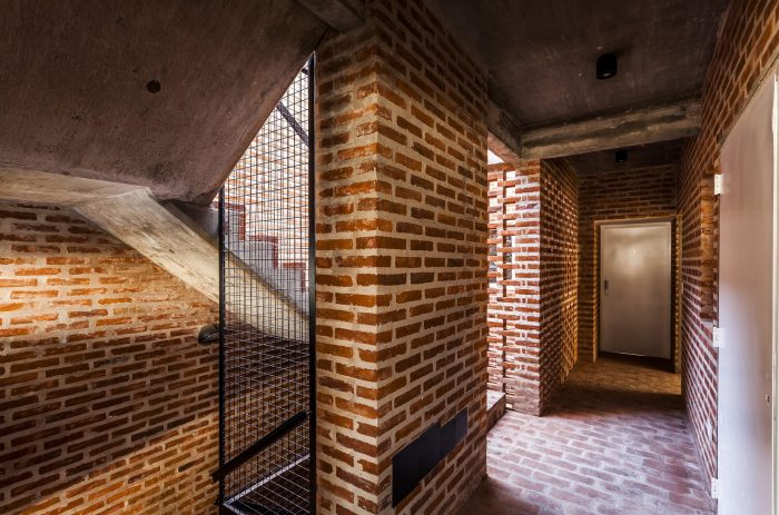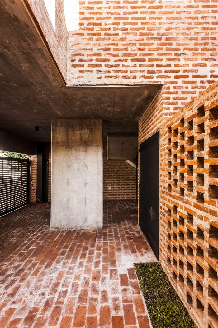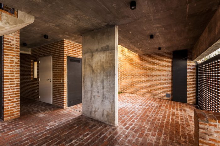 The structure is comprised of reinforced concrete, and the exterior envelope was built with common brick. The brick was arranged in different ways both to clad floors, walls and ceilings, as well as to achieve different levels of privacy, brightness and opacity. Contrasting the reddish color of the brick, interiors were finished with neutral materials, in gray and white colors.